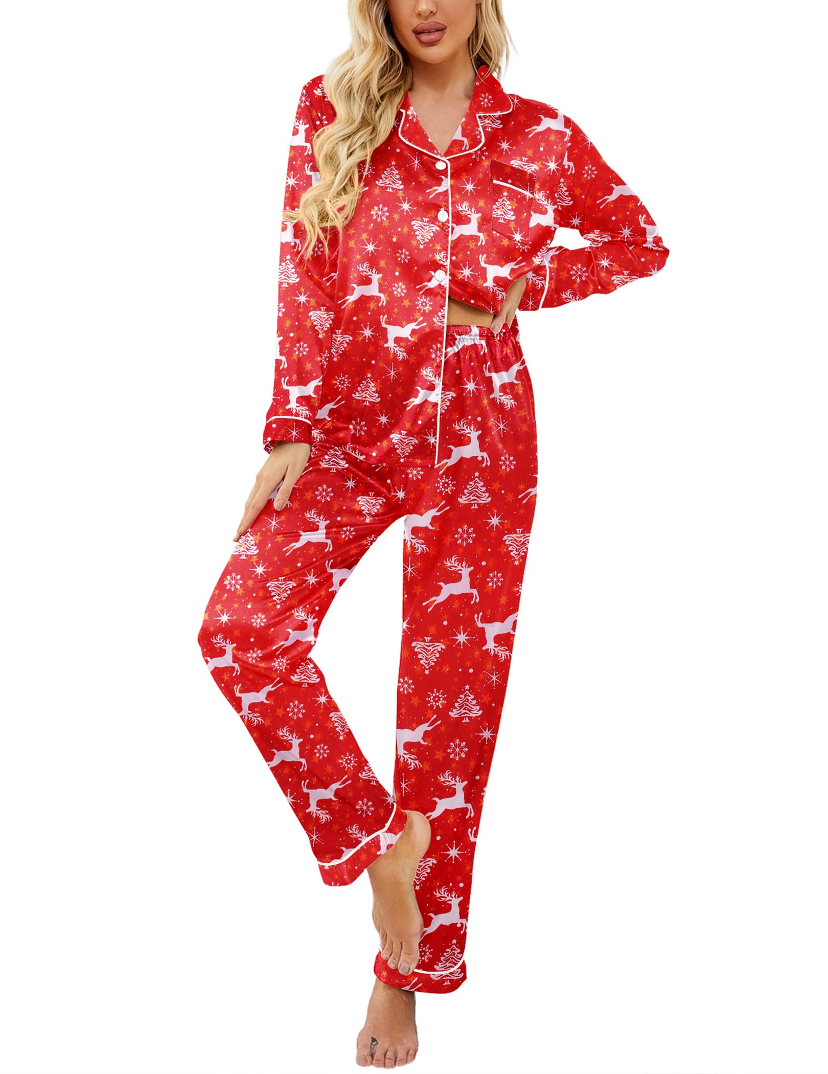MATERIAL:The pajamas set is made of premium satin fabric,skin friedndly,breathable,lightweight,kepps easeful sleeping at night