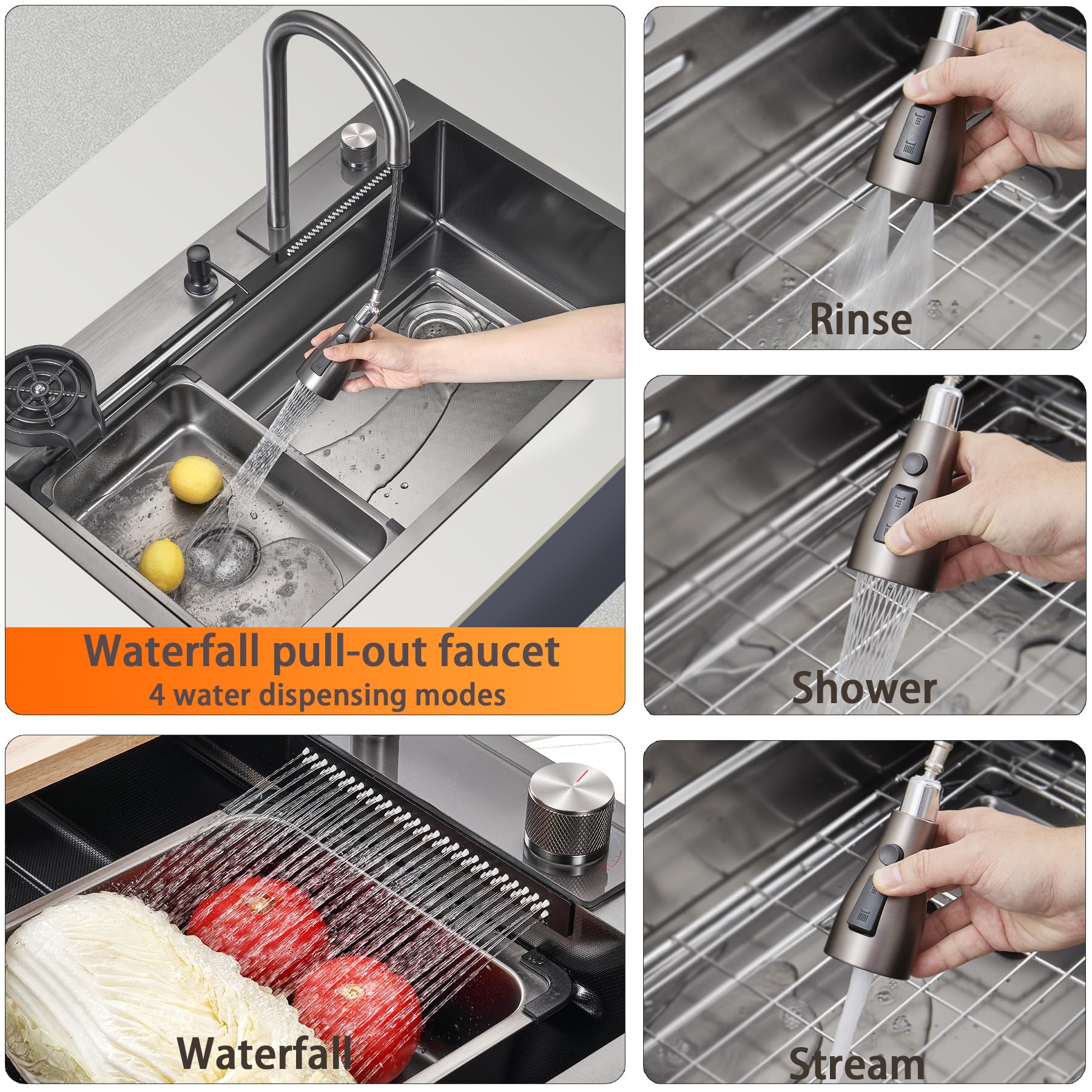 【Unique Faucet Design】The waterfall kitchen sink comes with a dedicated pull-out faucet, allowing easy operation within a flexible range of 23 in extension. Four cleaning modes (stream, spray, rinse, waterfall) cater to various water usage needs. A Black-gray knob switches between faucet and waterfall modes, ensuring simple and convenient operation.