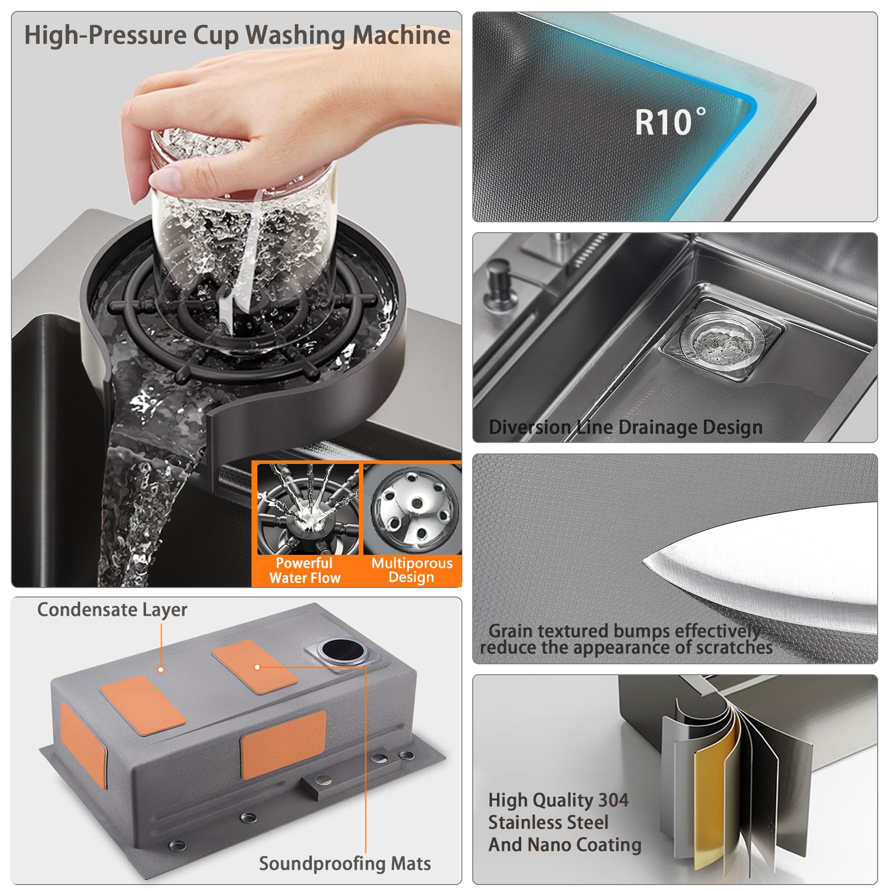 【High-Quality Material】Crafted from premium 304 stainless steel, this sink boasts corrosion resistance, high-temperature resistance, and rust ion. The surface features a granule texture design, effectively ing scratches and wear, providing optimal protection for the sink. The built-in nano-technology coating s the condensation of oil and water, making cleaning easier