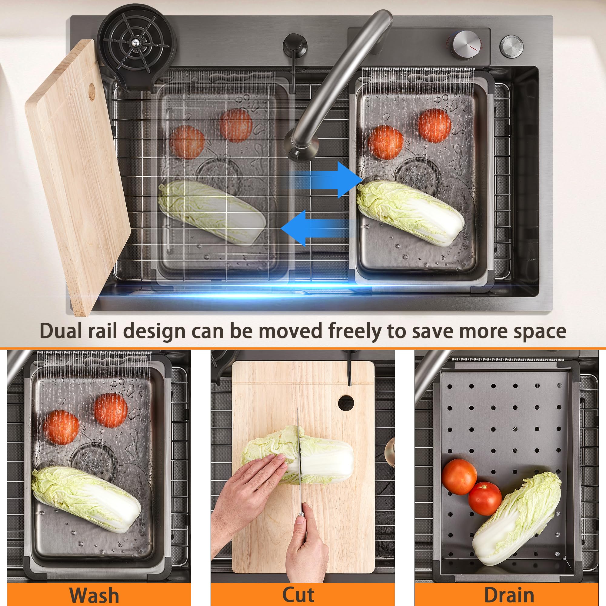 【Multi-functional Area】Featuring a dual-layer sliding design that can be moved left or right, equipped with a movable basin, draining basket, and cutting board. Easily achieve partitioned operations by flexibly moving these accessories, making tasks like chopping, thawing, and washing a breeze.
