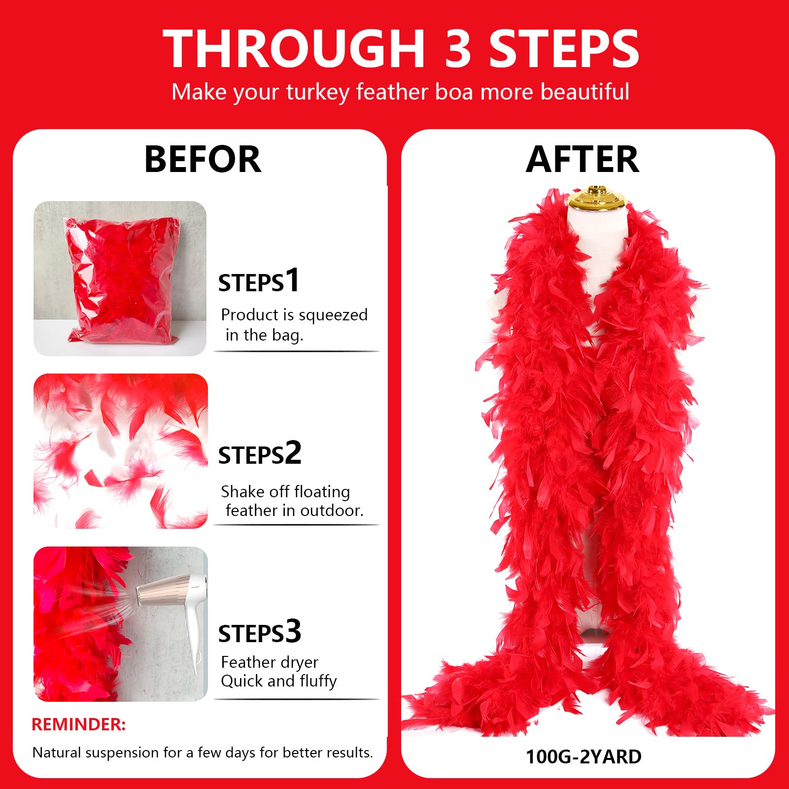 ❤️Precautions before use:Since our feathers are all natural and handcrafted,After you receive the boas, take them out of the package and shake them outdoor first, in order to get rid of debris and fallen feathers.Then hang it up for few hours before wearing. If you can hang up blowed few days, it will looks as the picture full and big.Of course,the longer you hang them up, the turkey feather boa will be more fluffy and the effect will be more stunning.