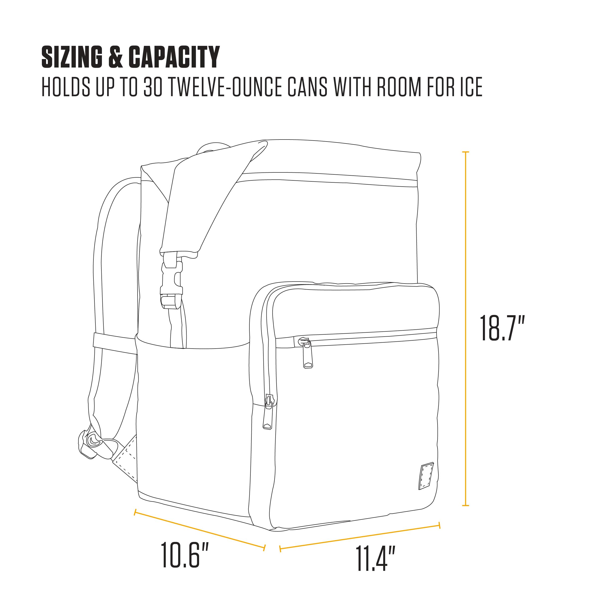 This 30-can insulated backpack is the largest Cold Front Cooler and it's perfect for any combination of snacks, drinks, or meals for the full family or group outing. Padded, breathable shoulder straps make it comfortable to carry, a wide opening makes it easy to find what you need inside, and a durable lining makes it easy to clean. Use the Carhartt logo on the corner as a bottle opener.