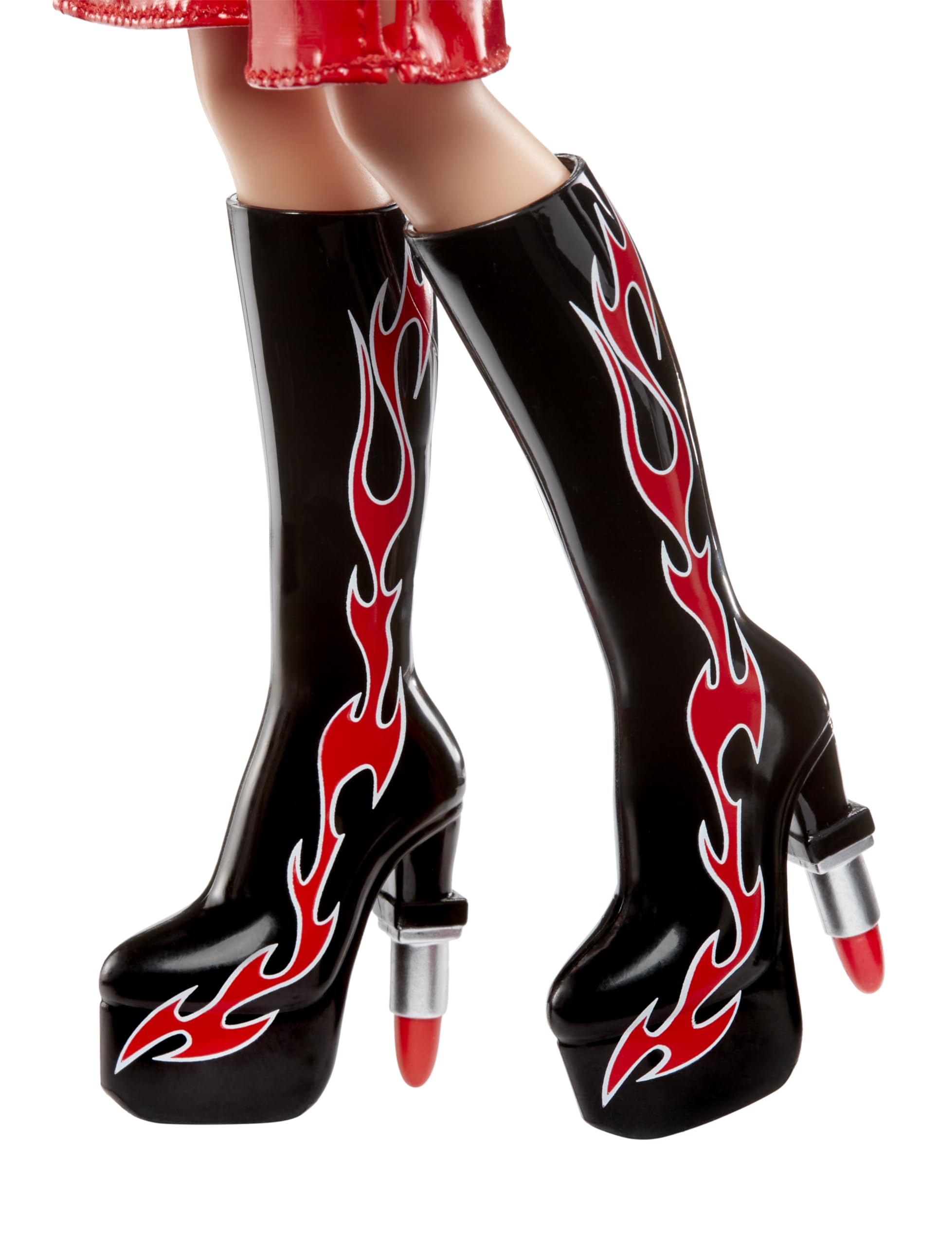 Get ready for fashion in the fast lane! Bratz is back with styles that are race day ready and totally SCORCHINβ! The girls with a passion for fashion are goinβ cruising in these moto-inspired looks. Jade is wearing a red racing jacket with matching leather, board shorts. Her accessories include a sleek pair of shades and platform boots with a lipstick heel and flame print design. Jadeβs look is finished off with a red lip and a long, blunt cut hairstyle.