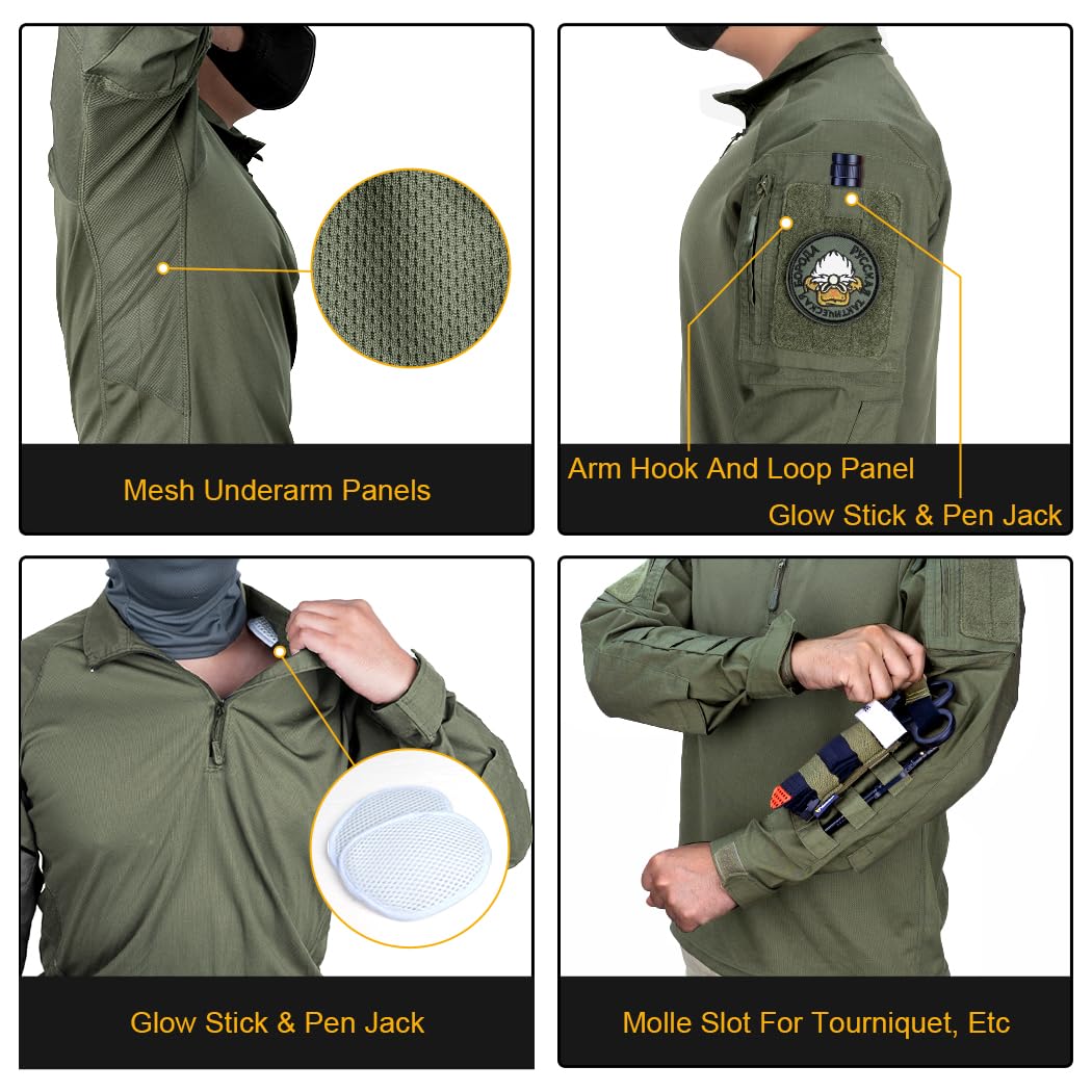 1.IDOGEAR Men's Combat Shirt is made from 100% polyester in the body, a 40% cotton, 55% polyester and 5% spandex blend in the arms, and moisture wicking mesh fabric made from 89%polyester and 11% spandex in the underarms to keep you dry during outdoor activities such as hiking, fishing and camping.