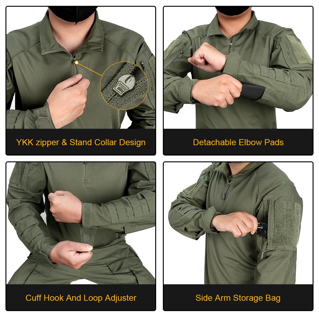 4. Adjustable hook and loop cuffs and removable elbow pads add versatility and comfort, and the double rows of Molle slots on the sleeves making it easy to stash small tactical items such as tourniquets in an emergency.