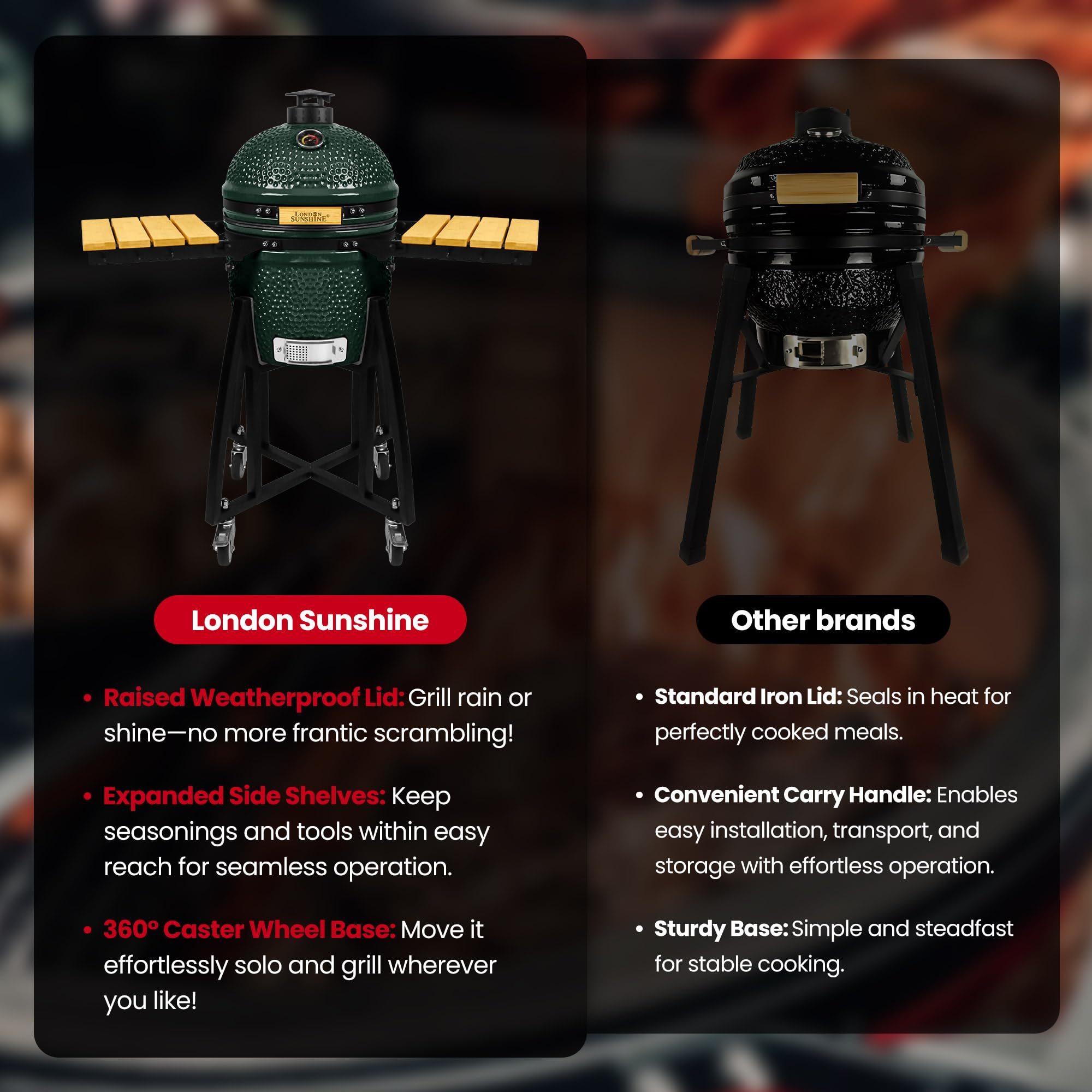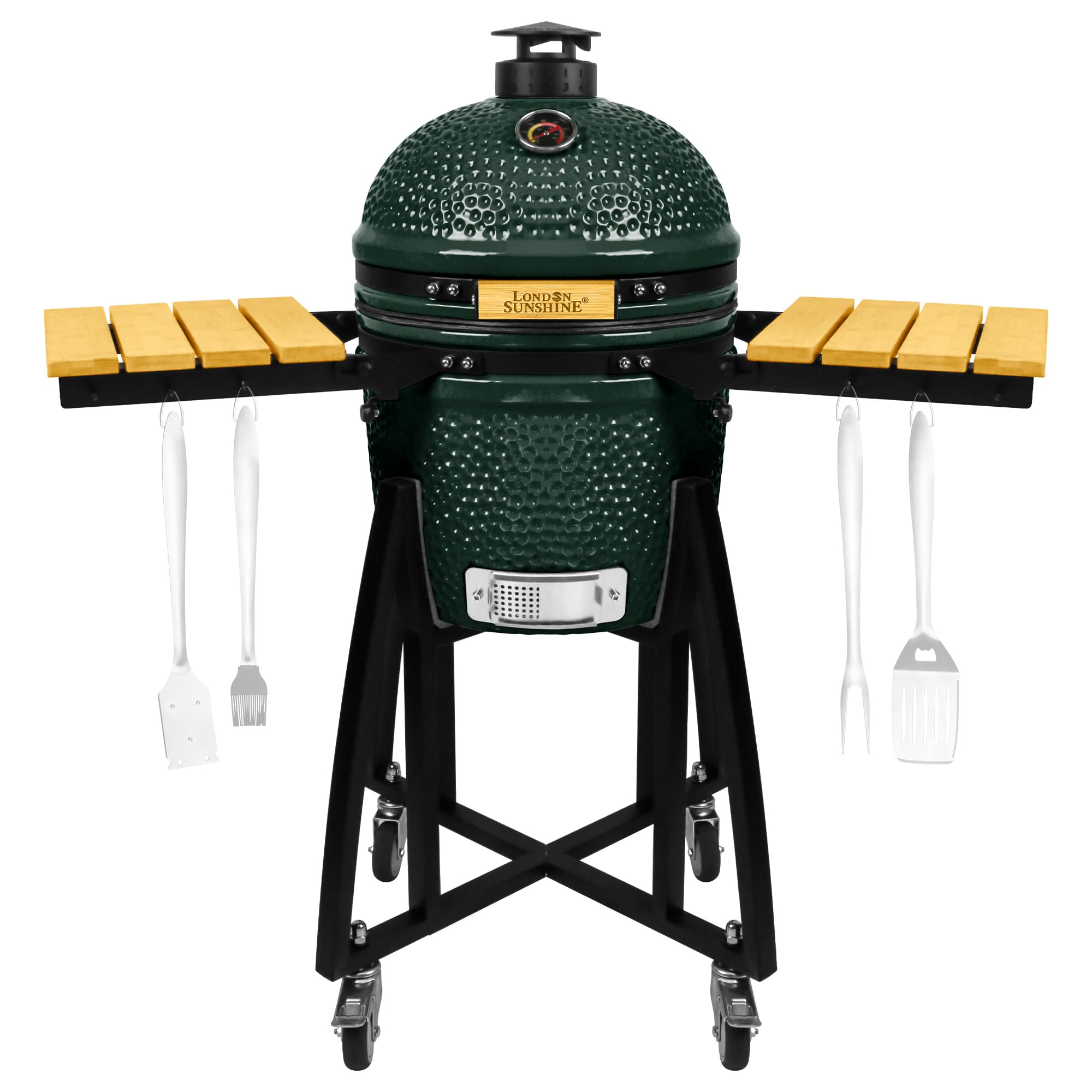 London Sunshine 15-inch Ceramic Kamado Charcoal BBQ Grill & Smoker with Locking Casters, Foldable Side Shelves, Stainless Steel Grates, and Tall Stand (Green)