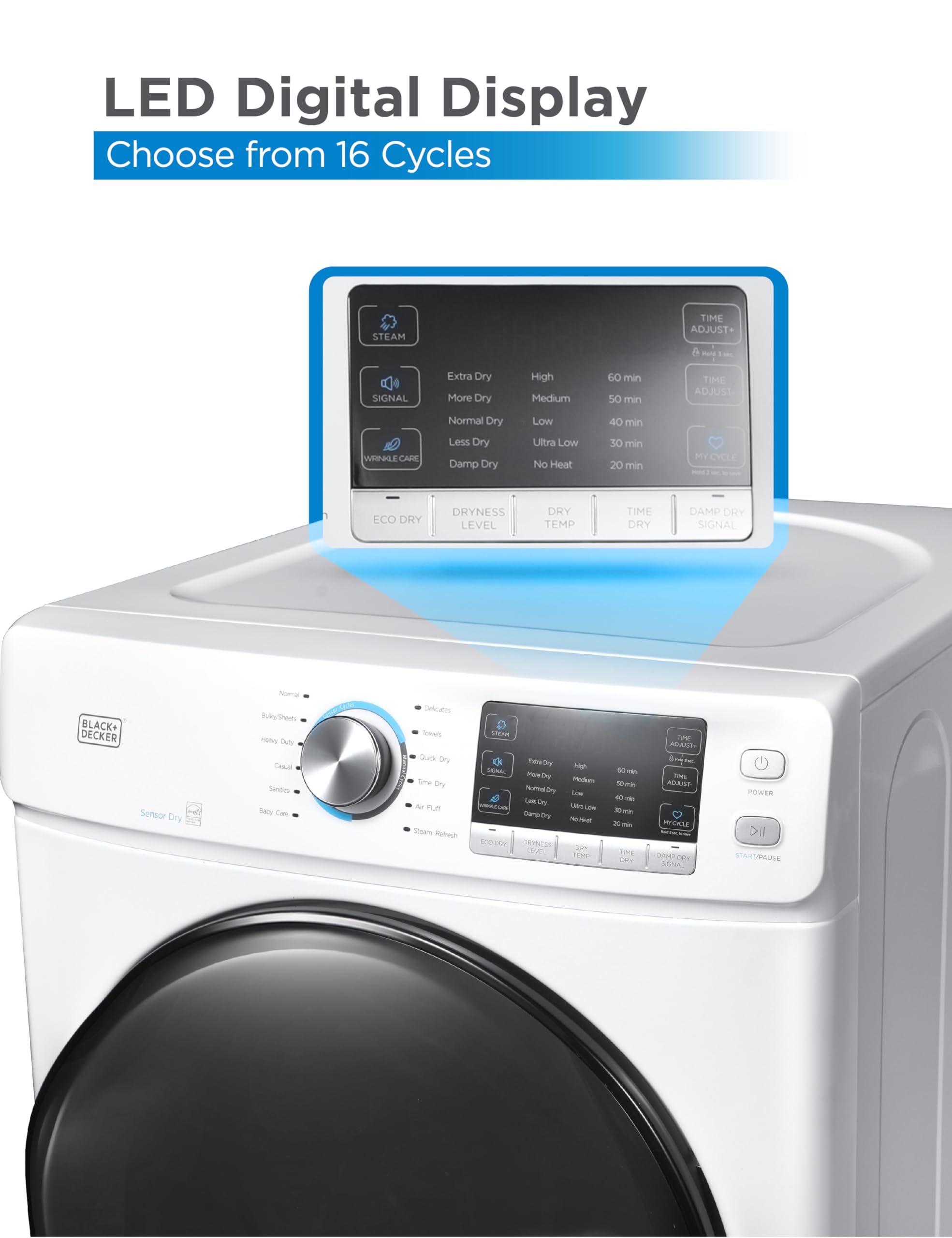 Versatile Drying Options: Offering 12 cycle selections along with sensor dry technology, this black and decker dryer provides tailored drying settings to achieve optimal laundry drying results
