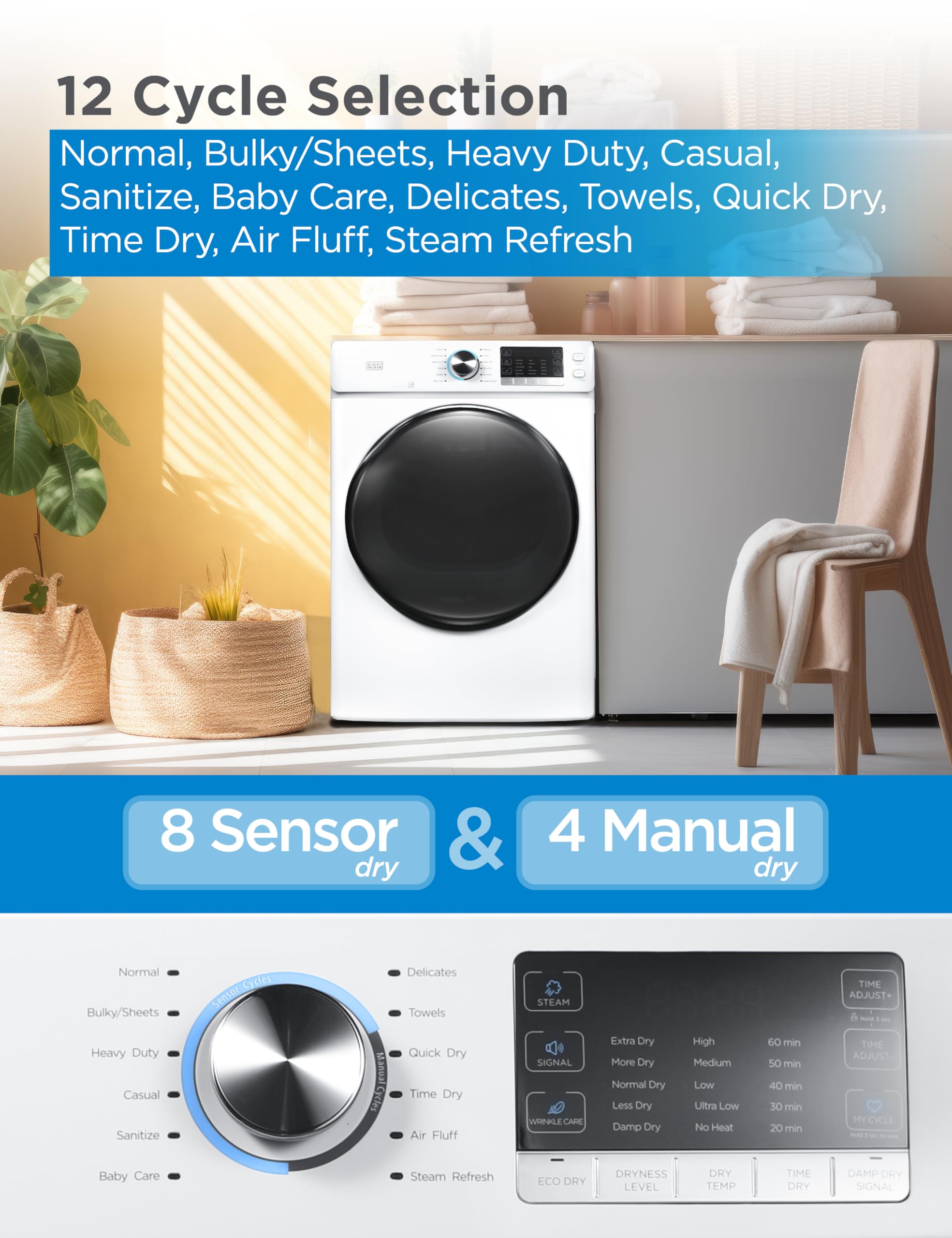 Large Drum Capacity: This dryer machine offers an 8 cu. ft. capacity with aluminized alloy steel drum for large laundry loads. Electric dryer machine full size meets demanding drying needs