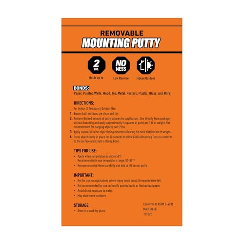 Gorilla Mounting Putty is ideal for hanging light weight items in place of traditional tapes, push pins, and fasteners. Squares are non-toxic, repositionable, and long lasting. Great for use indoors and temporary outdoor use. Use on paper, painted walls, wood, tile, metal, posters, plastic, glass, and more! Directions: 1. Ensure both surfaces are clean and dry. 2. Remove desired amount of putty squares for application. Use directly from package without kneading and apply approximately 4 squares of putty per 1lb of weight. Not recommended for hanging objects over 2lbs. 3. Apply square(s) to the object being mounted allowing for even distribution of weight. 4. Press object firmly in place for 30 seconds to allow Gorilla Mounting Putty to conform to the surface and create a strong bond. Tips for Use: • Apply when temperature is above 50°F. Recommended in use temperature range: 50-85°F (10-30°C) • Remove mounted items carefully and dab to lift excess putty. Important: • Not for use on applications where injury could result if mounted item fell. • Not recommended for use on freshly painted walls or flocked wallpaper. • Avoid direct exposure to water. • May stain some surfaces. Click the Gorilla link at the top of this page to see more great products from Gorilla.