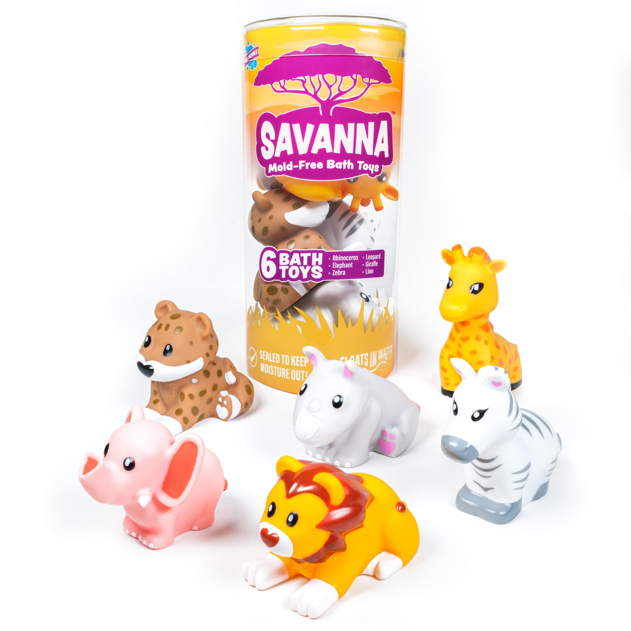 SAVANNA 6 PACK: Set includes (6) exclusive Mold Free Bath Toys featuring fun Savanna animals - Rhino, Elephant, Zebra, Leopard, Giraffe & Lion - must-have tub toys for a roaring good bathtime!