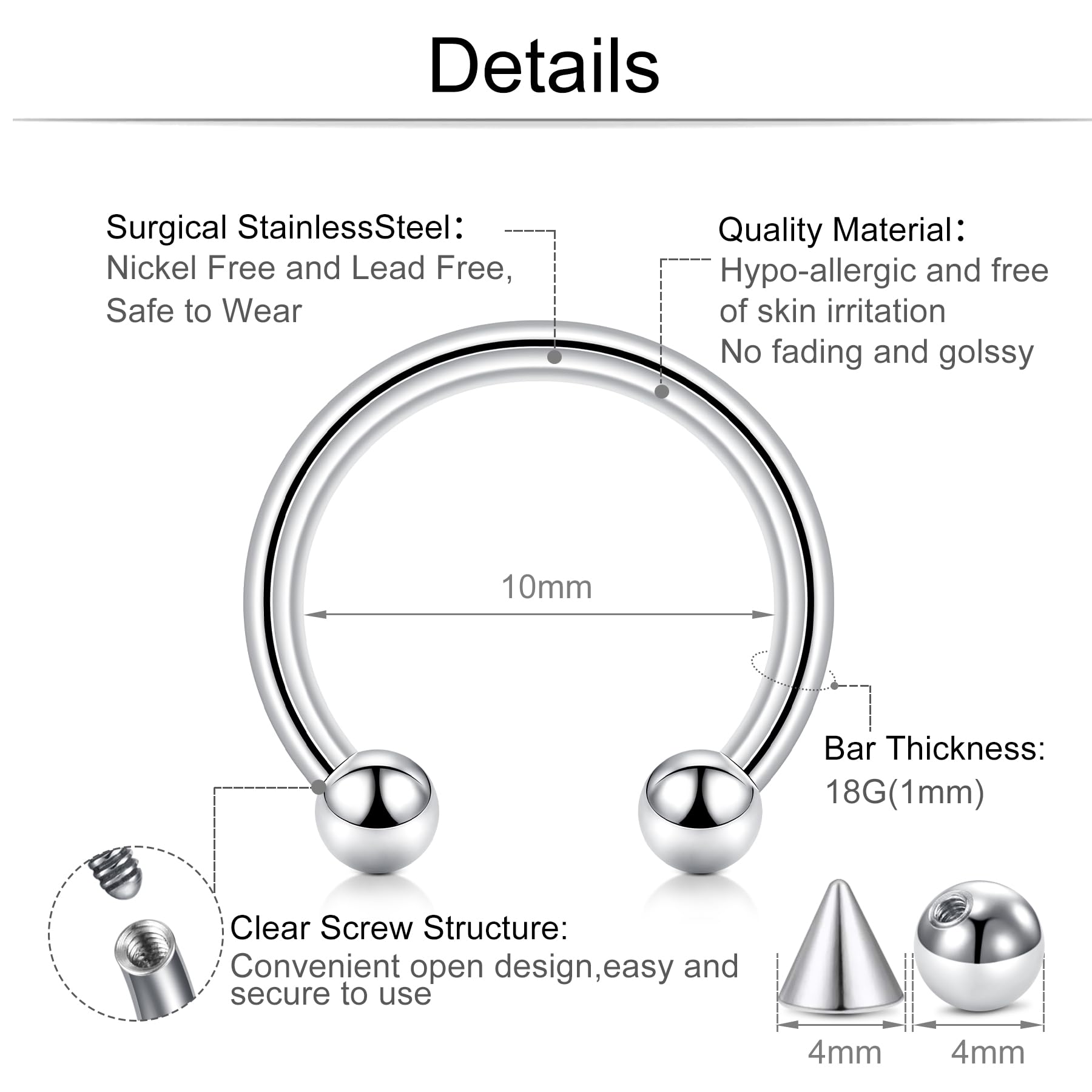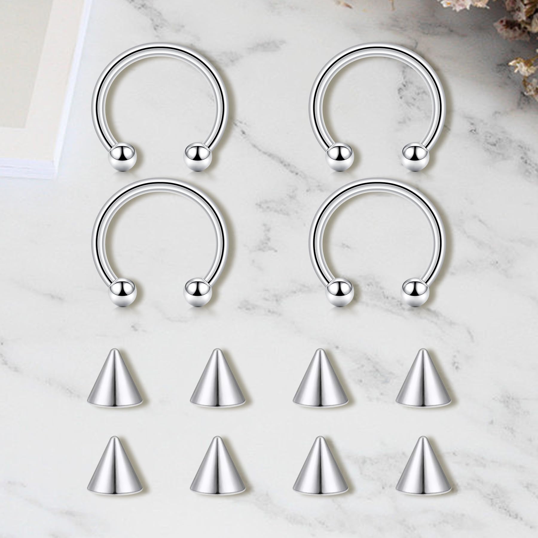 [Total 4pcs] 4pcs silver daith earrings with 8pcs silver replacement spikes, 18G(1.0mm); Inner diameter: 10mm (3/8"), ball size: 4mm, replacement spikes size: 4mm