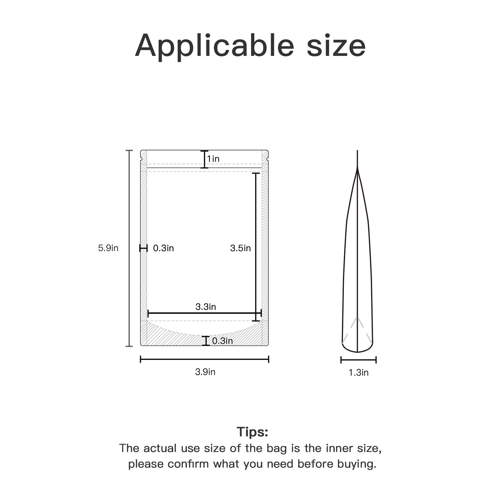 【Quantity & Material】Package include 100 pieces Clear stand up pouches. Outer dimension:3.9*5.9inch,Inner dimension:2.8*4inch; Made from food grade plastic, which is odorless, reusable and moisture proof, keeps your products freshness.Practical bags for packing product.Please note that the size is small, please check the size before ordering.
