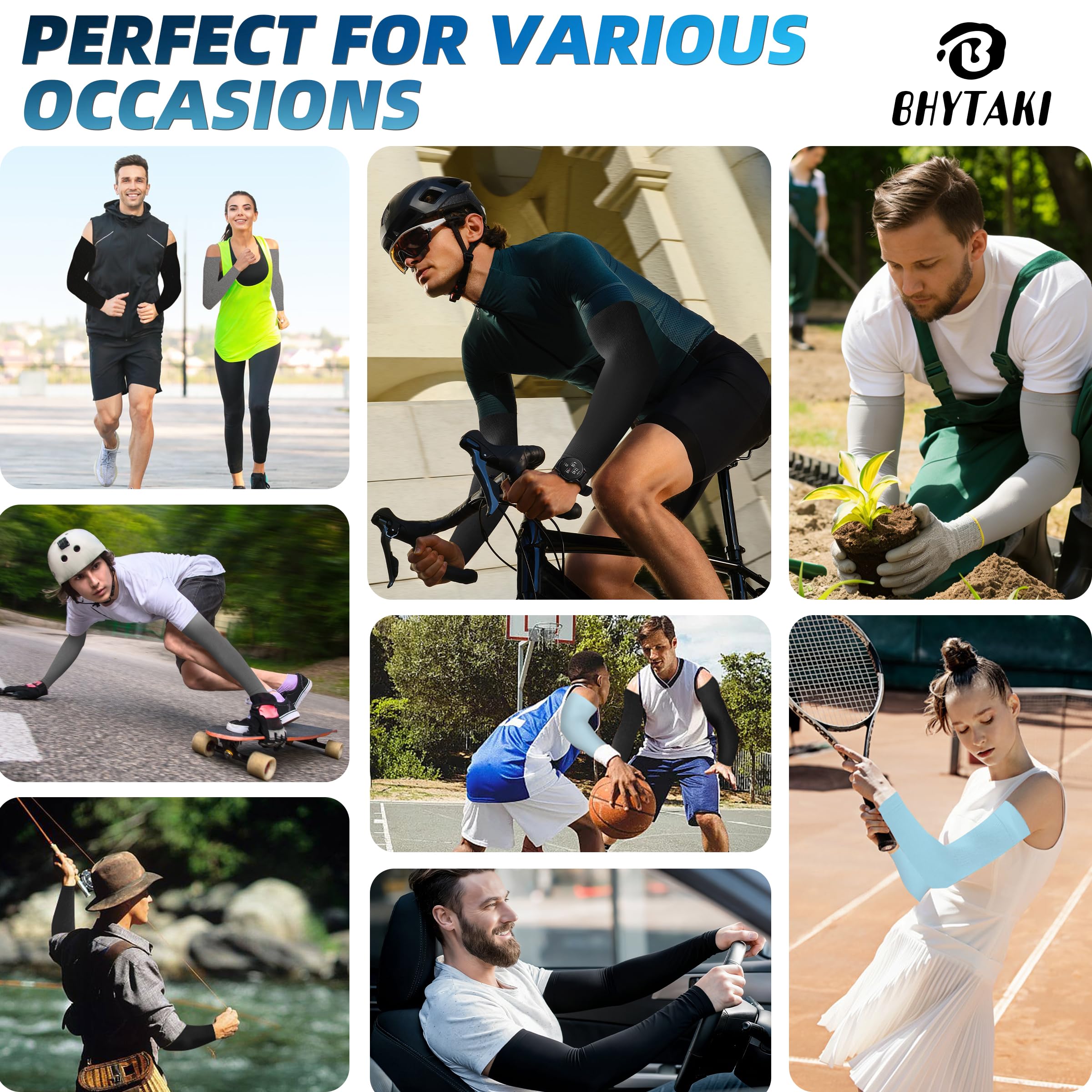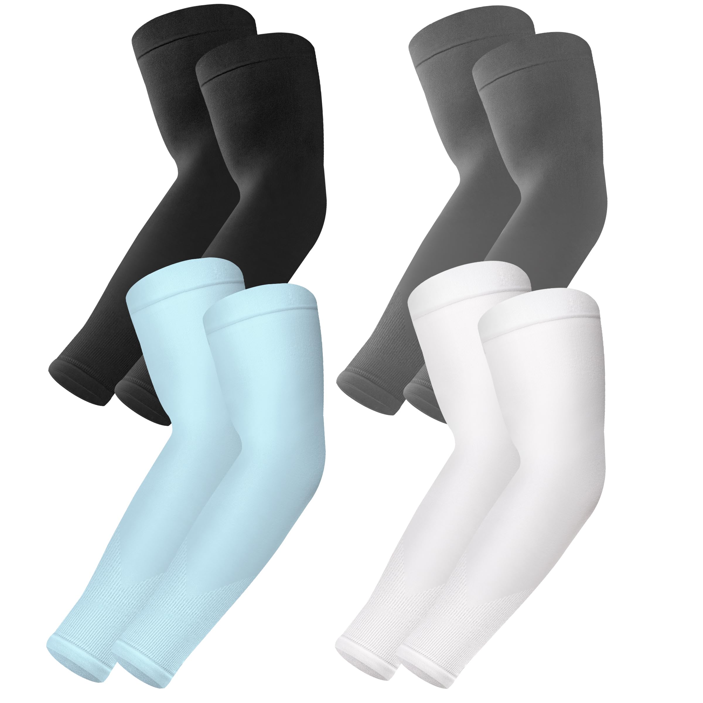 【Arm Sleeves UPF50+ Protection Design】Our arm sleeves set contains - 1 pairs of Black+1 pairs of Dark Gray+1 pairs of White+1 pairs of Light Blue. Our UPF 50+ sun sleeves for men women are made of high-quality soft fabric with added anti-ultraviolet ingredients , can really block up to 98% of harmful UVA and UVB rays, can block harmful sunlight when playing golf, shooting, running, cycling, gardening, working, etc., and prevent skin from sunburn and aging.