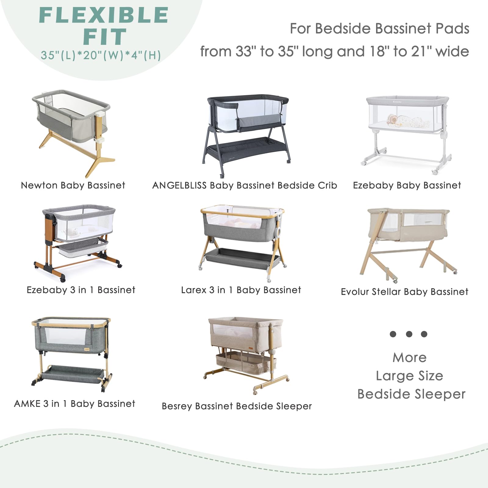 FLEXIBLE FIT - These rectangle bassinet sheets measure 35x20 inches and made specifically for large size bedside sleeper bassinets such as Newton baby bassinet, Angelbliss baby bassinet bedside crib, Ezebaby/Larex/AMKE 3 in 1 baby bassinet. With an elastic band around the bottom edge of each sheet to ensure a snug fit, these bassinet mattress sheets are flexible fit pads from 18" to 21" wide and 33" to 35" long