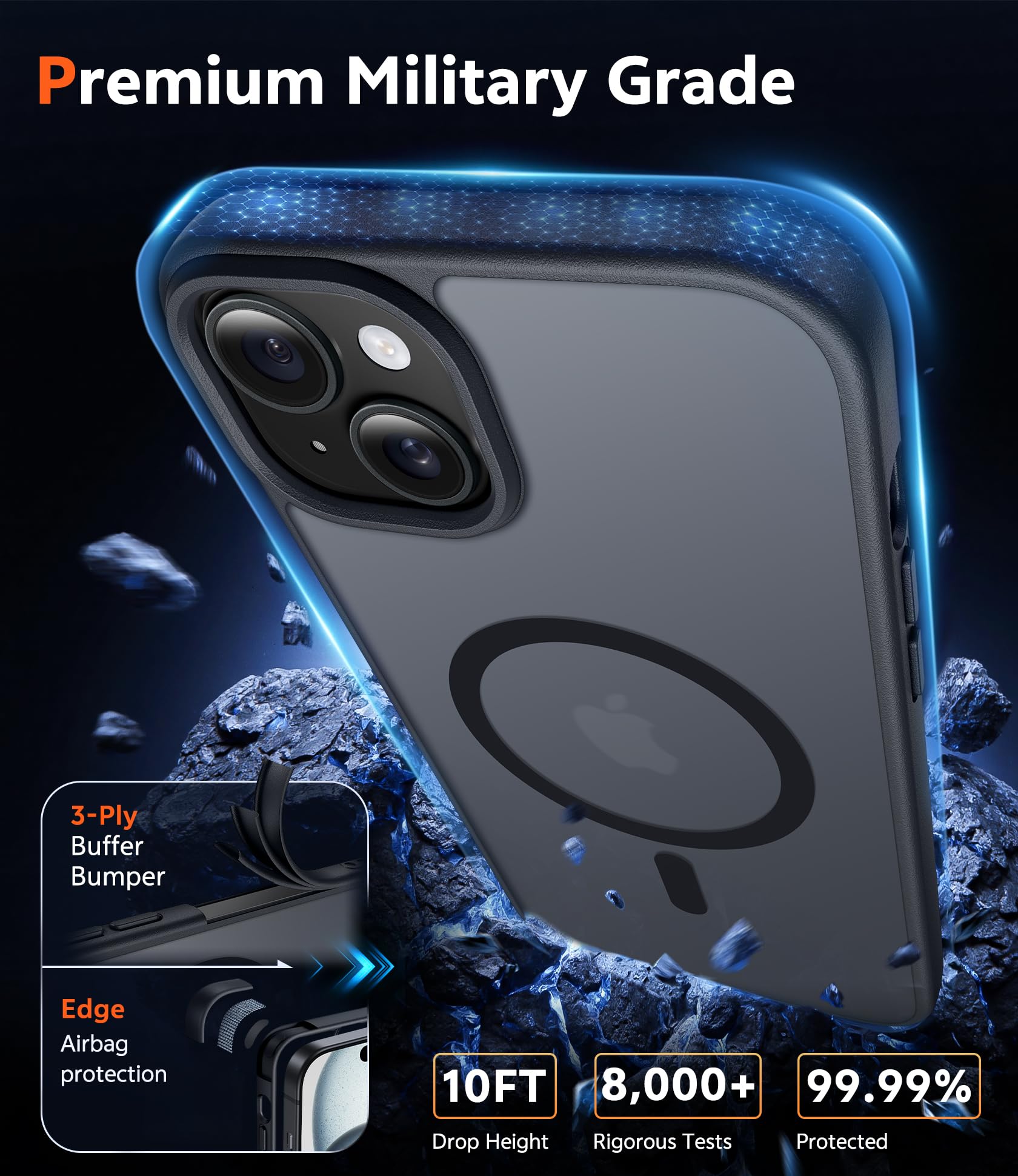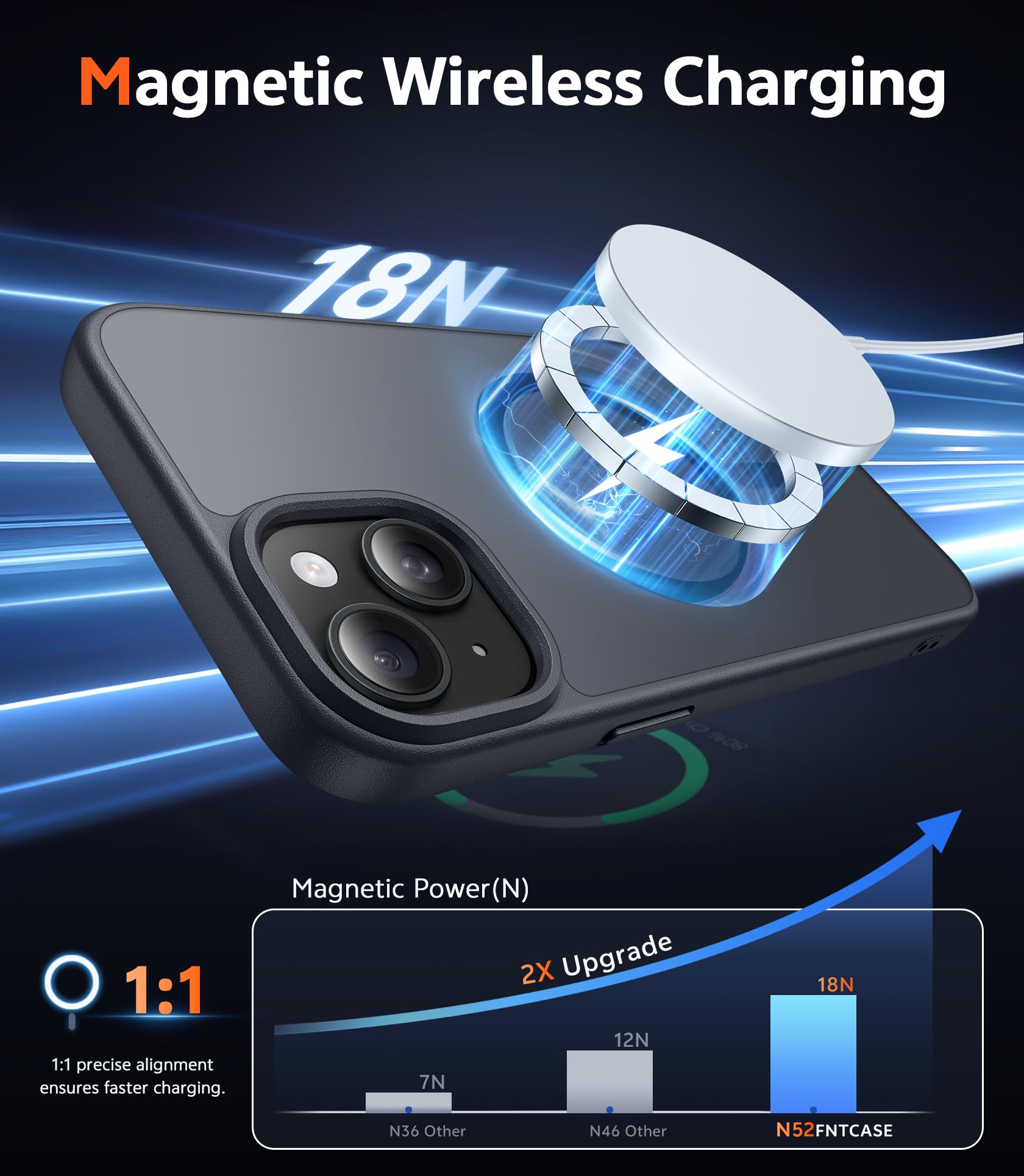 Powerful Magnetic Force: Aligns perfectly with wireless power bank, wallets, car mounts and wireless charging stand. The iPhone 15 plus magnetic case has built-in 38 super N52 magnets. Its magnetic attraction reaches 2400 gf, which is almost 7X stronger than ordinary, therefore it won't fall off no matter how it shakes when you are charging