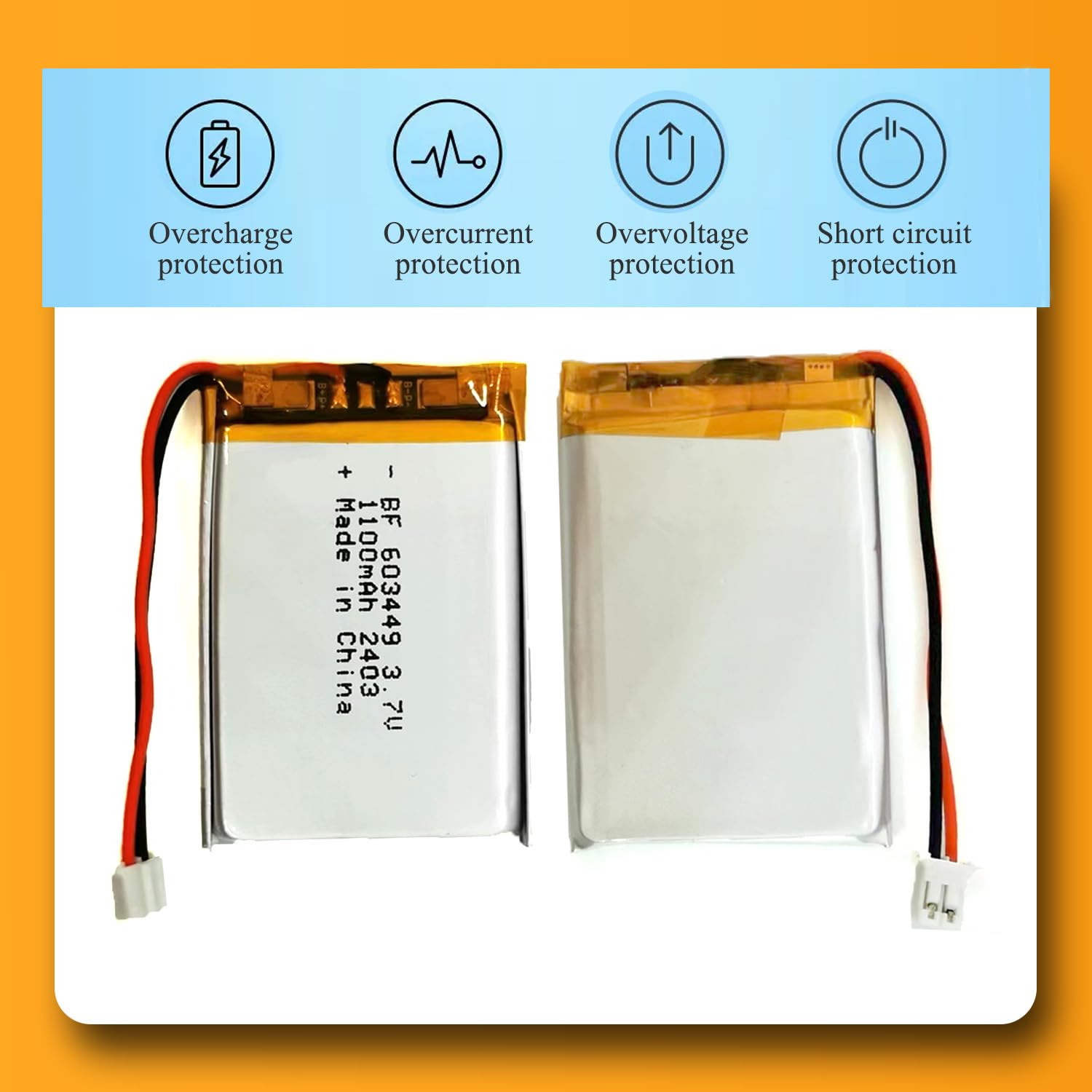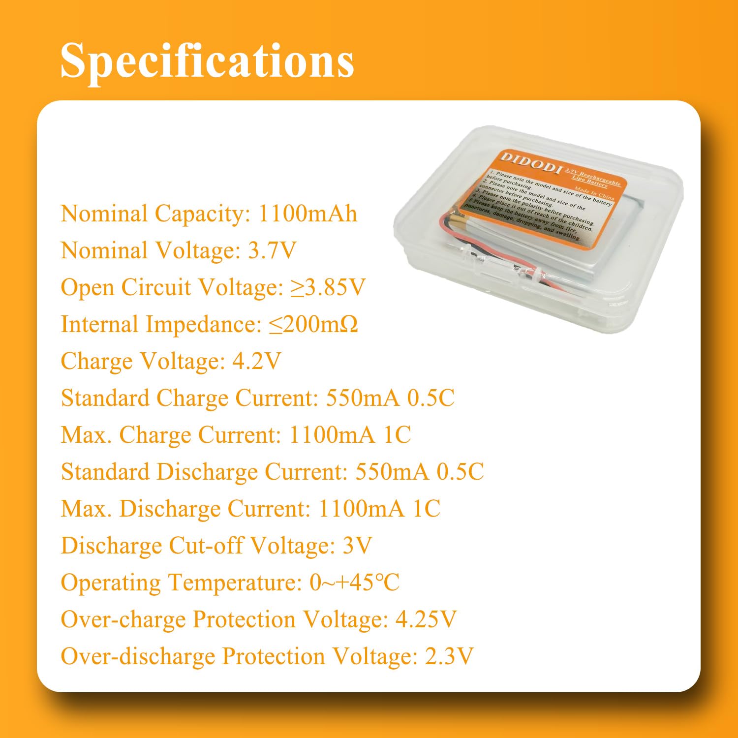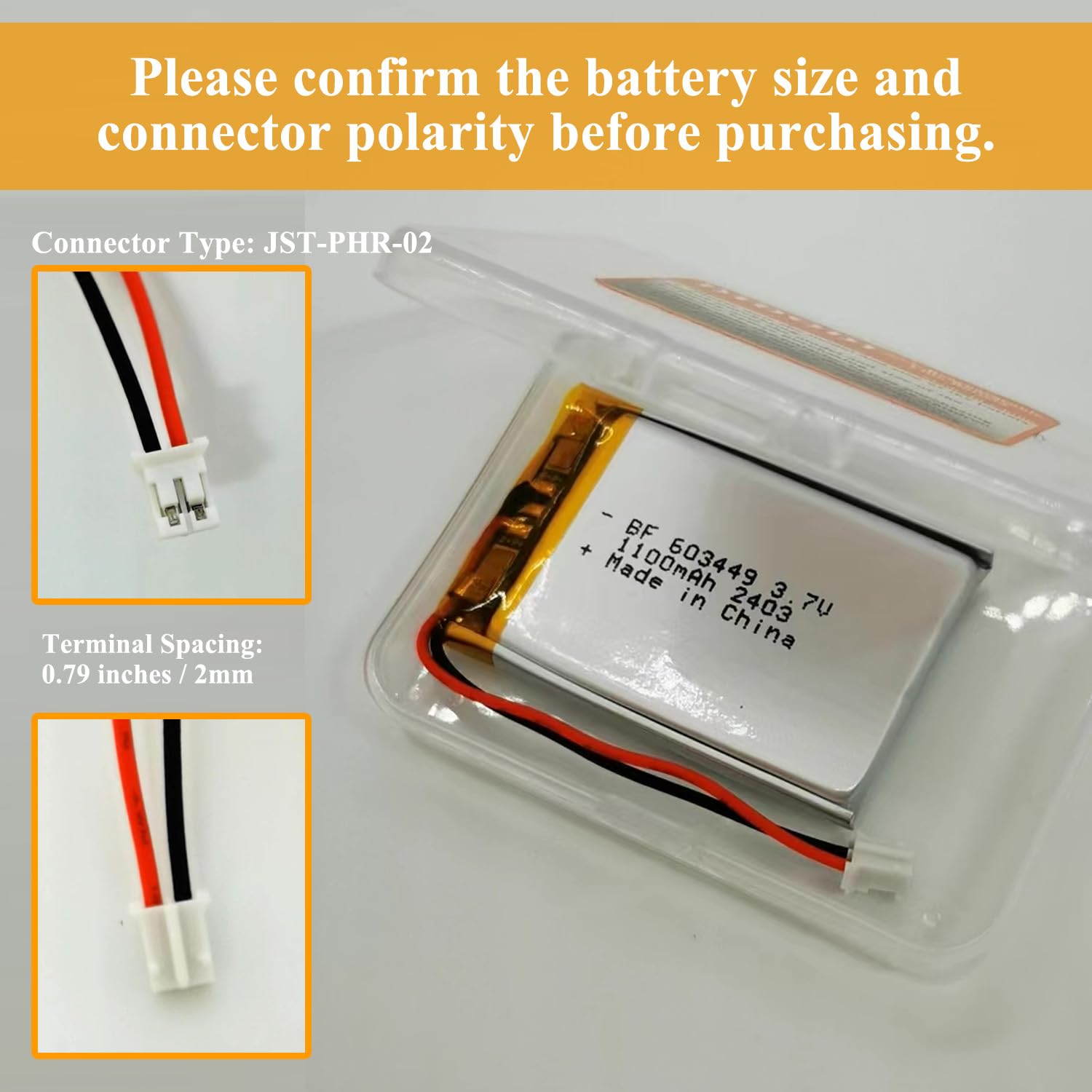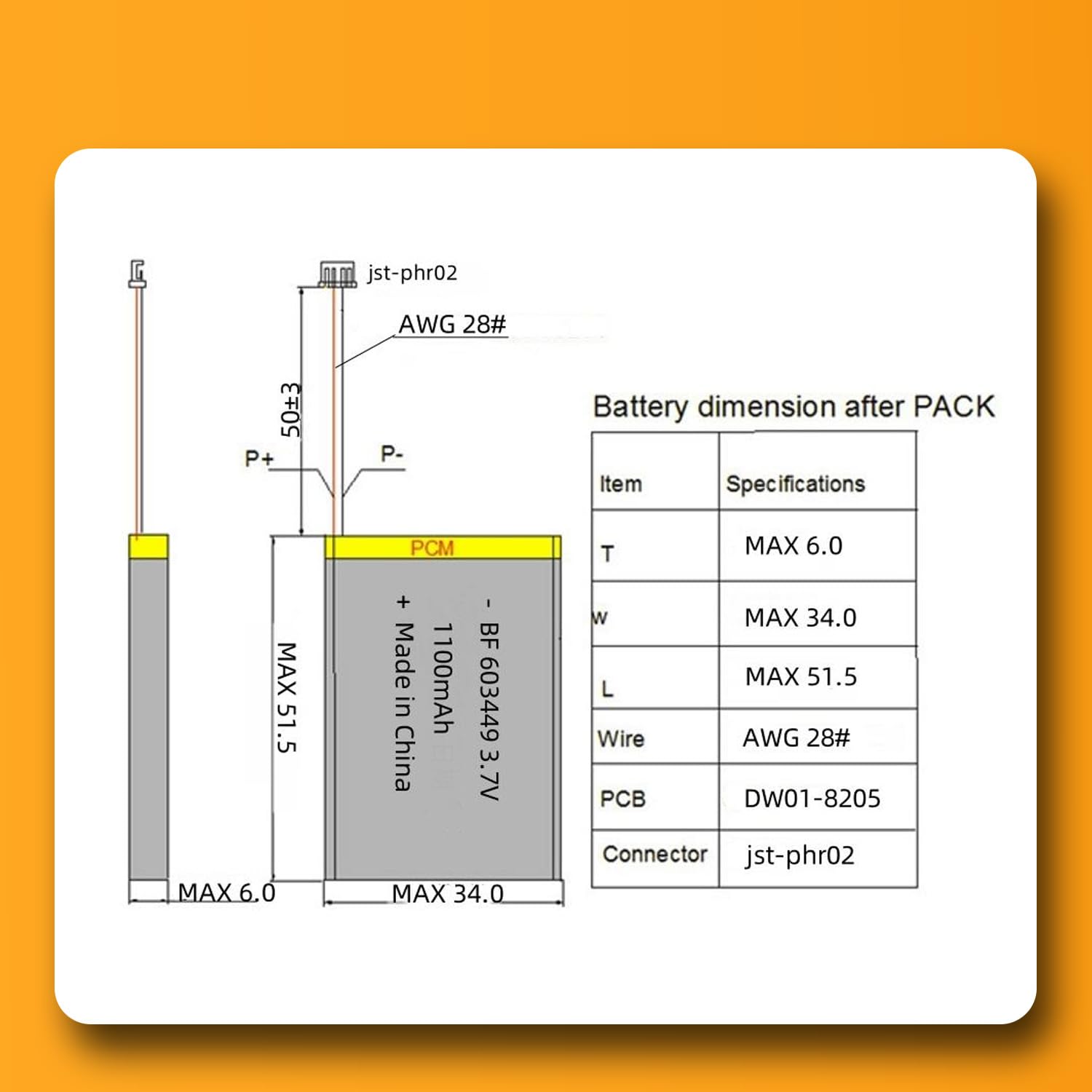 Specifications: Voltage: 3.7V; Typical capacity: 1100mAh, Weight: 26g; Battery size (WxLxH): 34.0 X 51 X 6 mm / 1.35 X 2.0 X 0.24 inch; Connector type: JST-PHR2.0 (Holes Spacing 2.0mm).