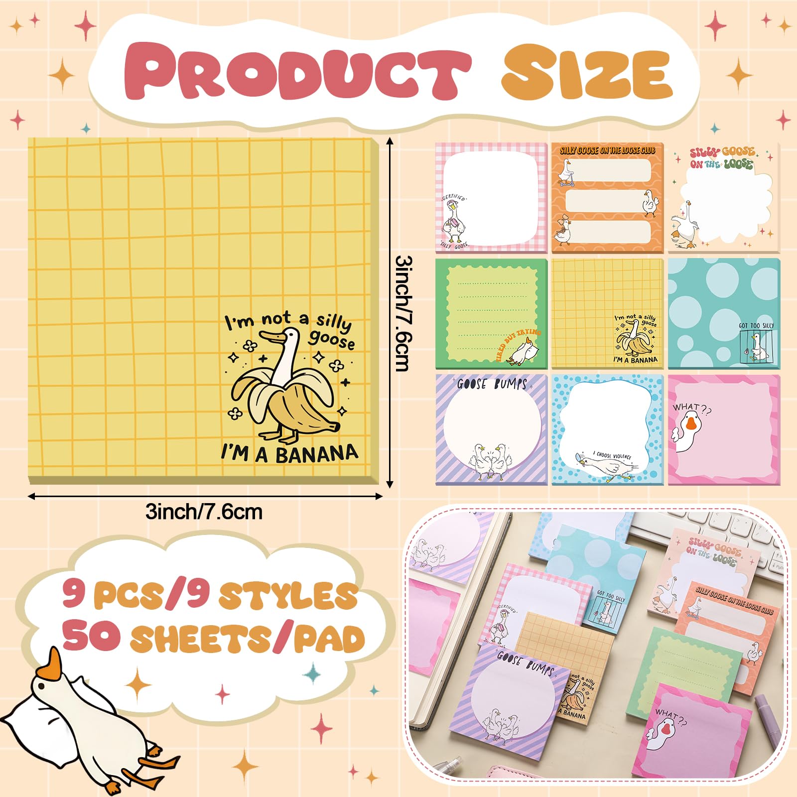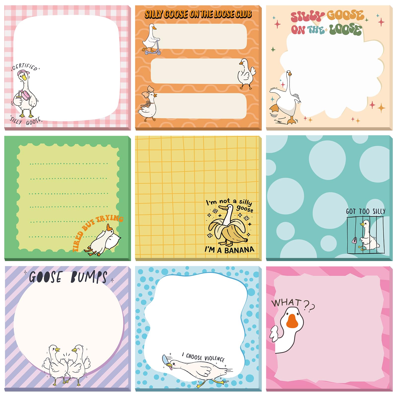 Package Contains: the set of goose sticky note pads includes 9 pads, with 50 sheets each, providing a total of 450 useful and attractive notes; Each note measures about 3 x 3 inches/ 7.6 x 7.6 cm, poised to assist in organizing and efficiency tasks