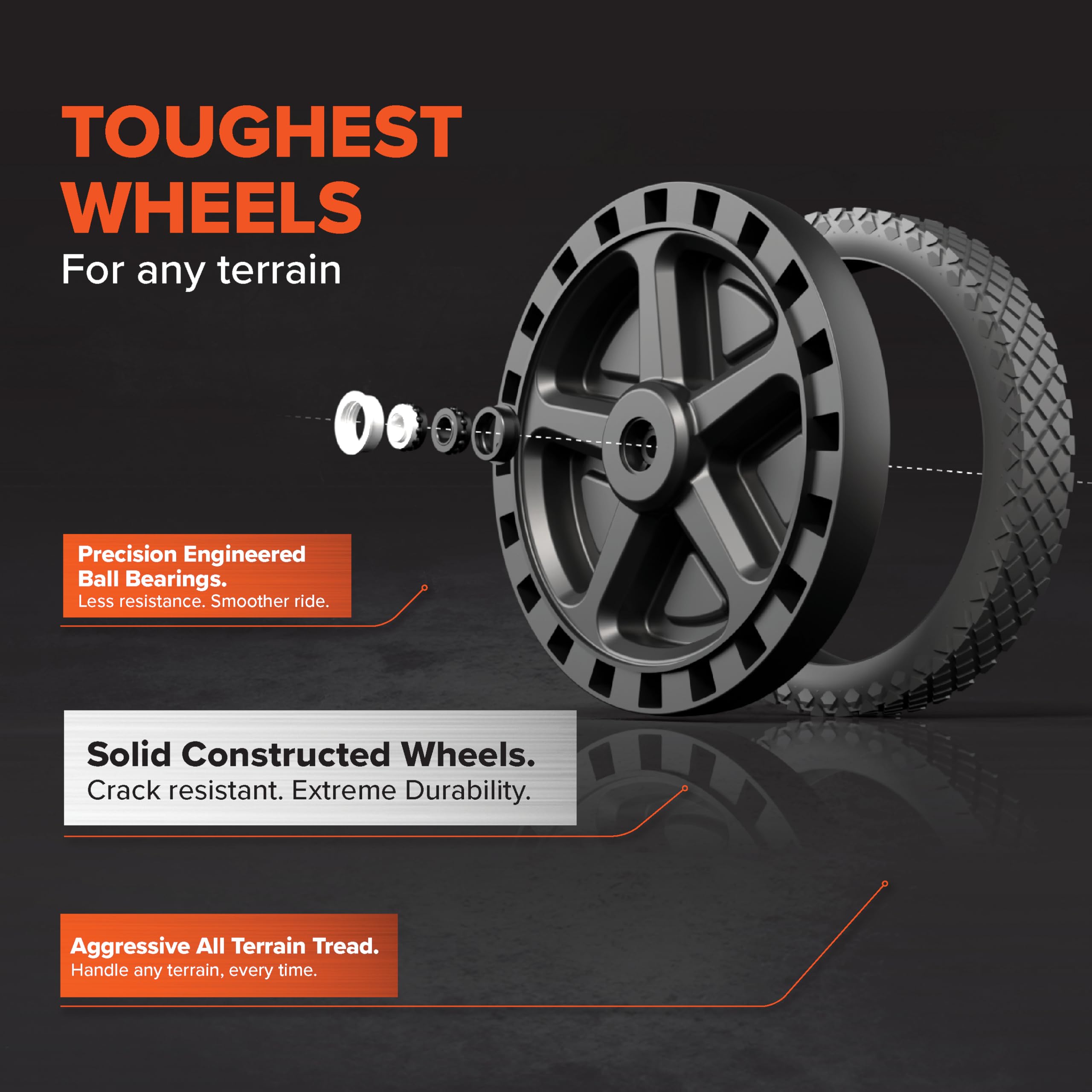 Effortless Transport: Haul your waste with ease with no-flat wheels built for any terrain, an oversized handle for easy maneuvering, & a steel tow adapter for effortless towing behind a truck or golf cart.