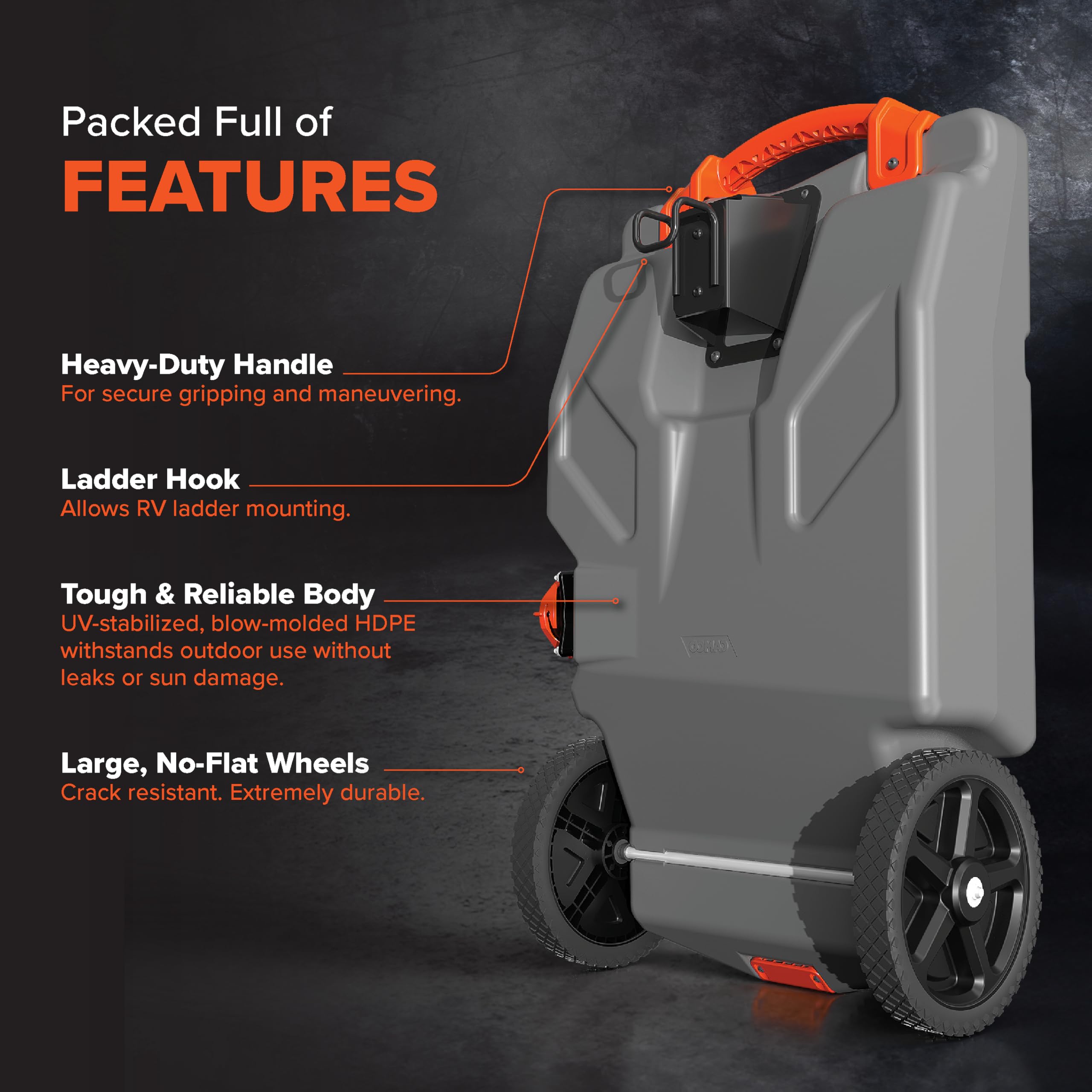RV Tote Tank Features: Rhino’s 36-Gallon Tote Tank is equipped with (2) oversized wheels, a large handle, tank rinser, ladder hook, and gate valve for easy use.