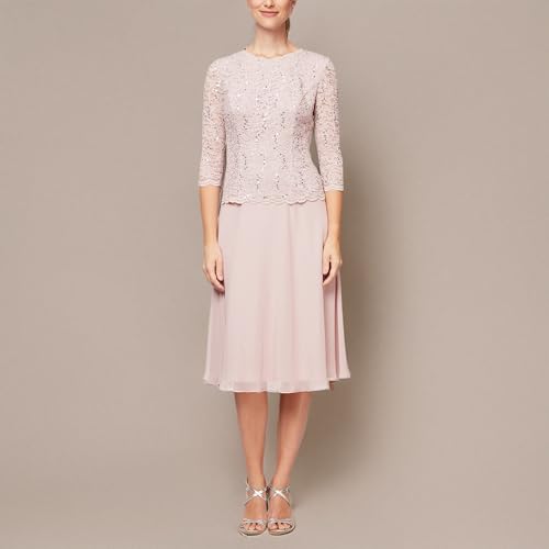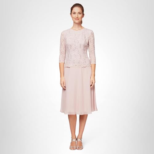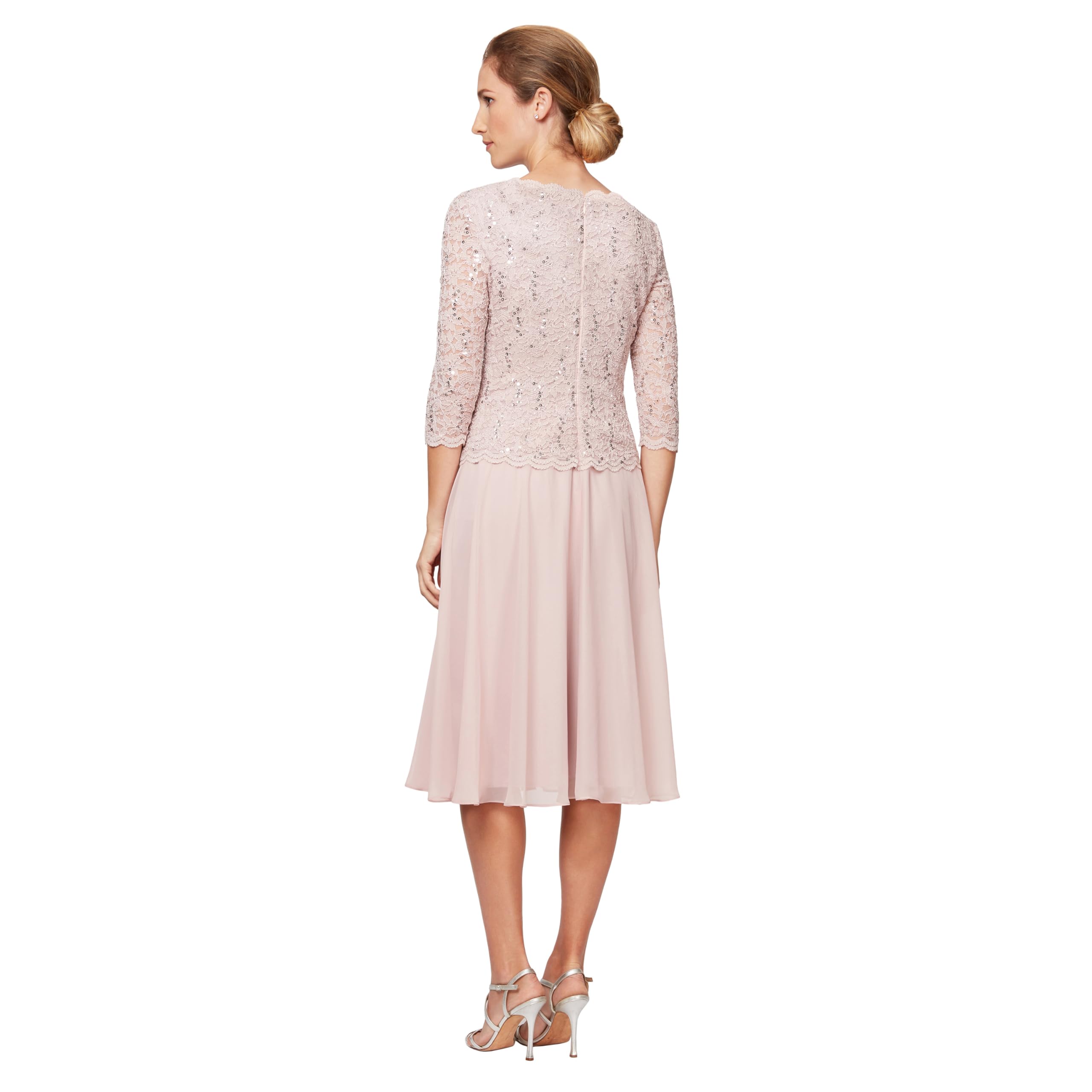 Description Our tea-length mock 2-piece cocktail dress is the picture of elegance with sheer lace sleeves, silky chiffon skirt & scalloped lace edges. Perfect for Mother-of-the-Brides (& Grooms)! Hand wash in cold water Lay flat to dry Items must be unworn, unwashed and undamaged, with all tags attached Final sale items cannot be returned Items sent back without authorization, or an Alex Evenings return label, may not be eligible for refunds