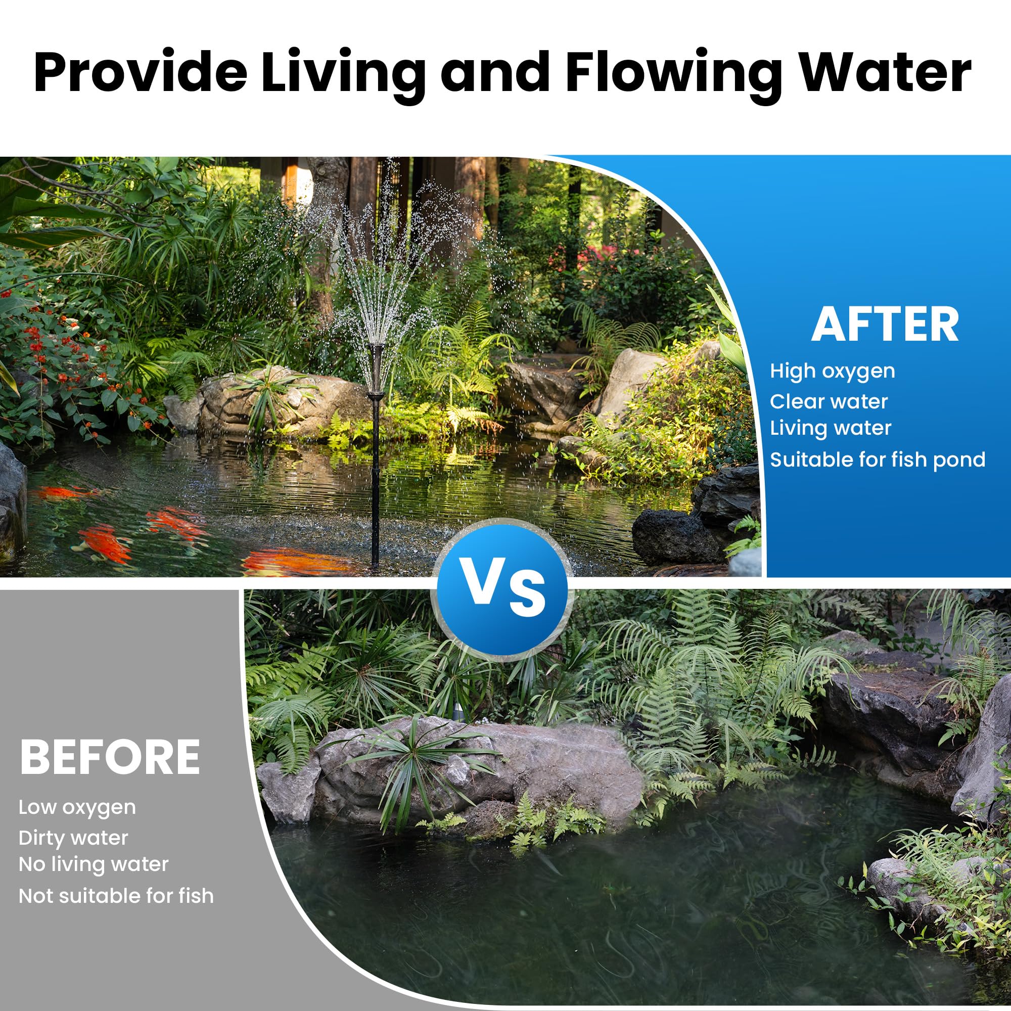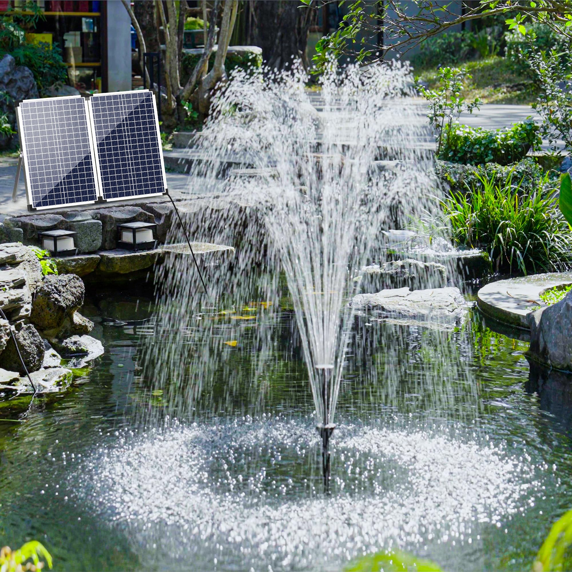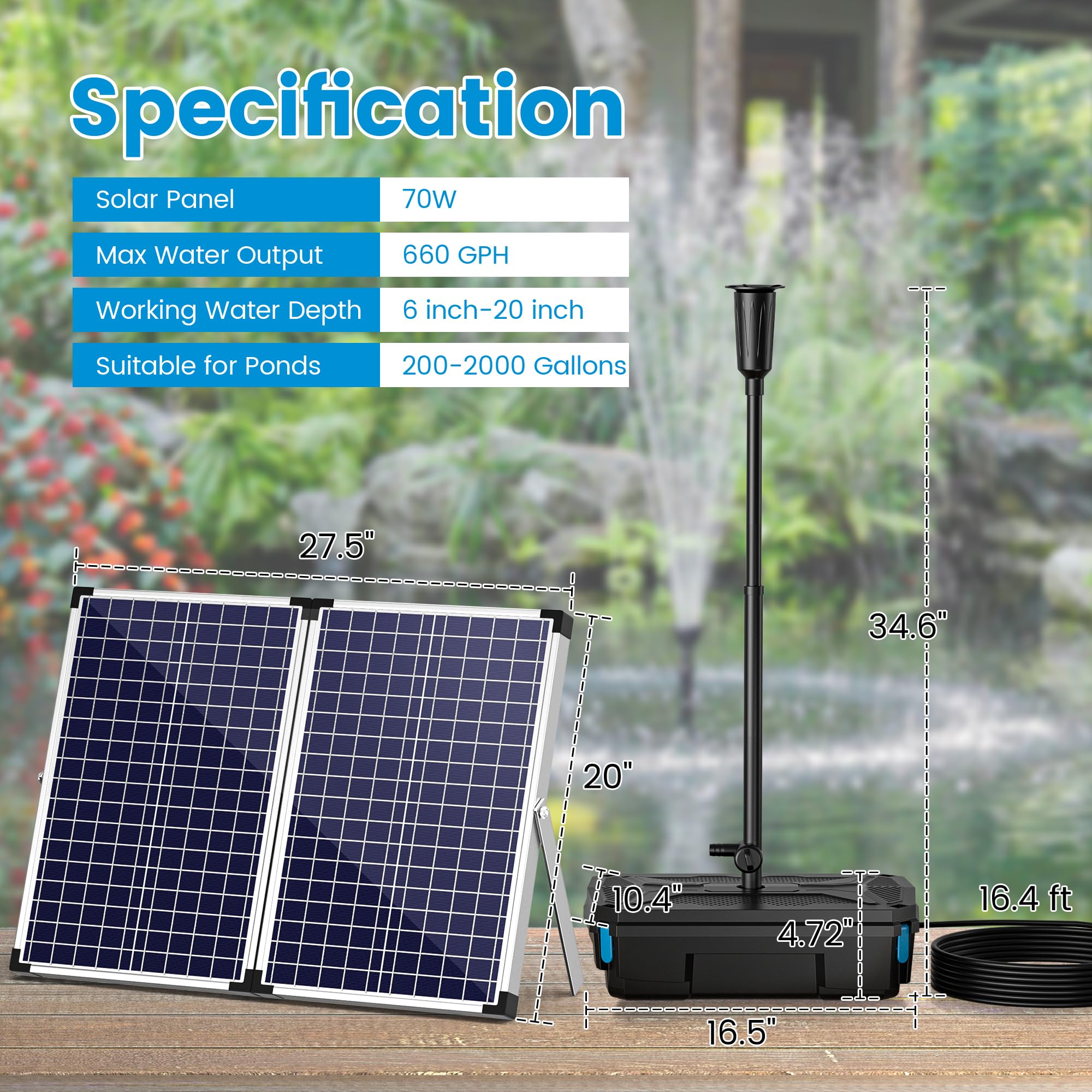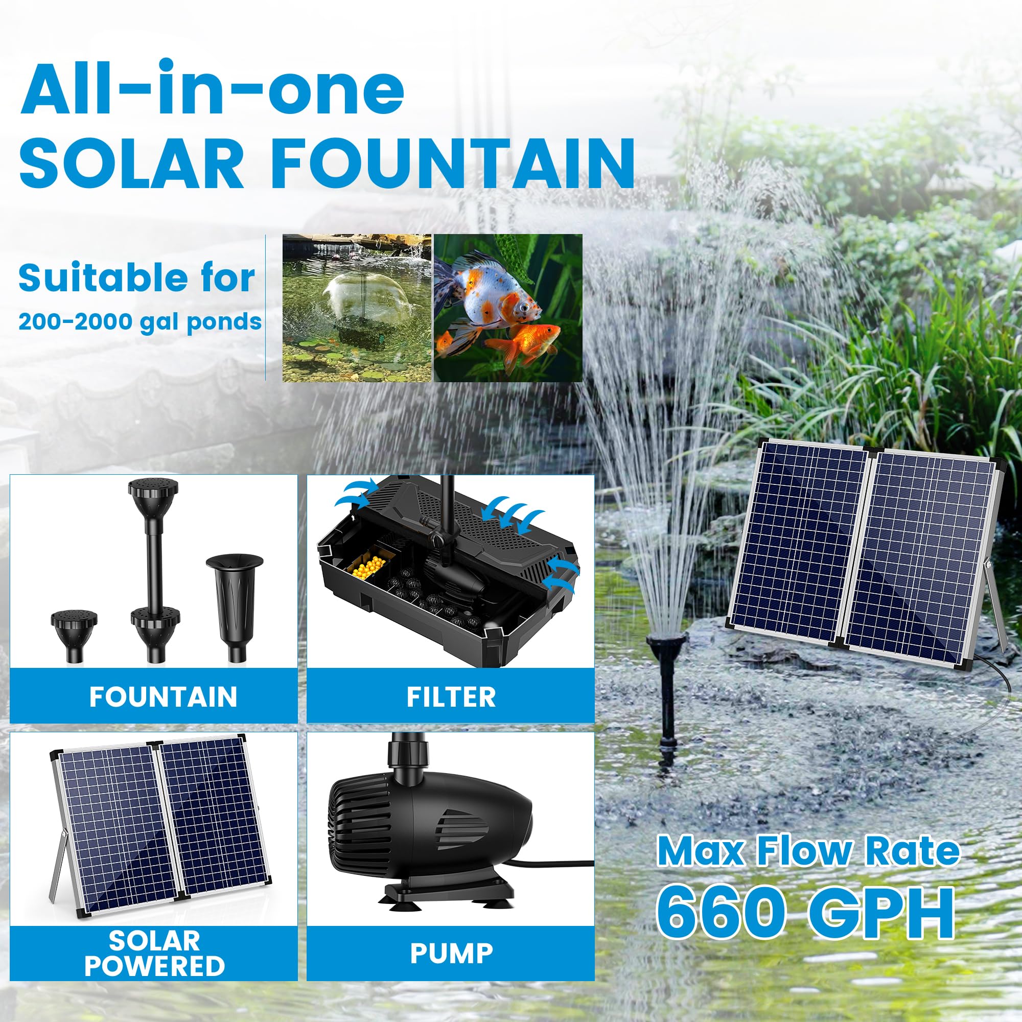 Solar Powered Powerful Water Pump: It is powered by a 70W solar panel and is suitable for use in outdoor ponds without electricity. Built-in 660GPH submersible pump can be used in ponds up to 2000 gallons