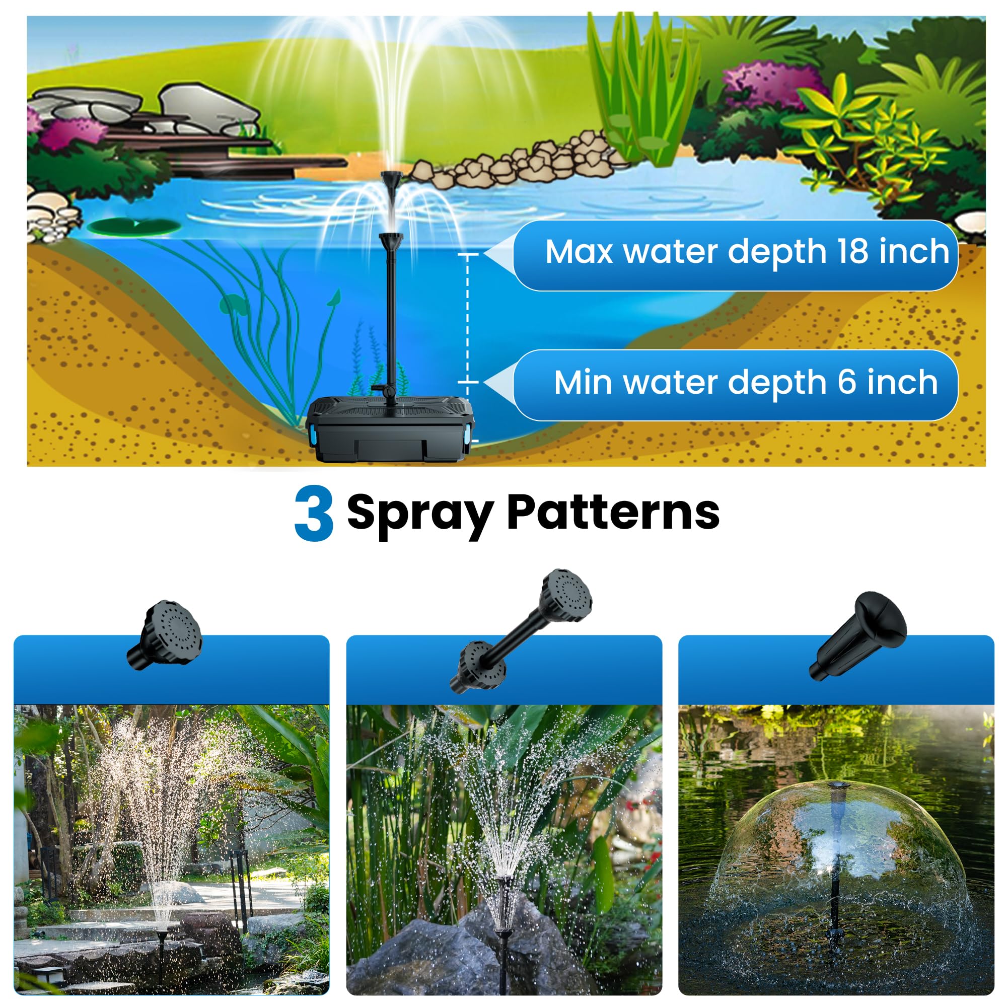 All-in-one Design: Complete pond kit including solar pond fountain system and pond filtration system. It integrates filtration, aeration, fountain, water supply