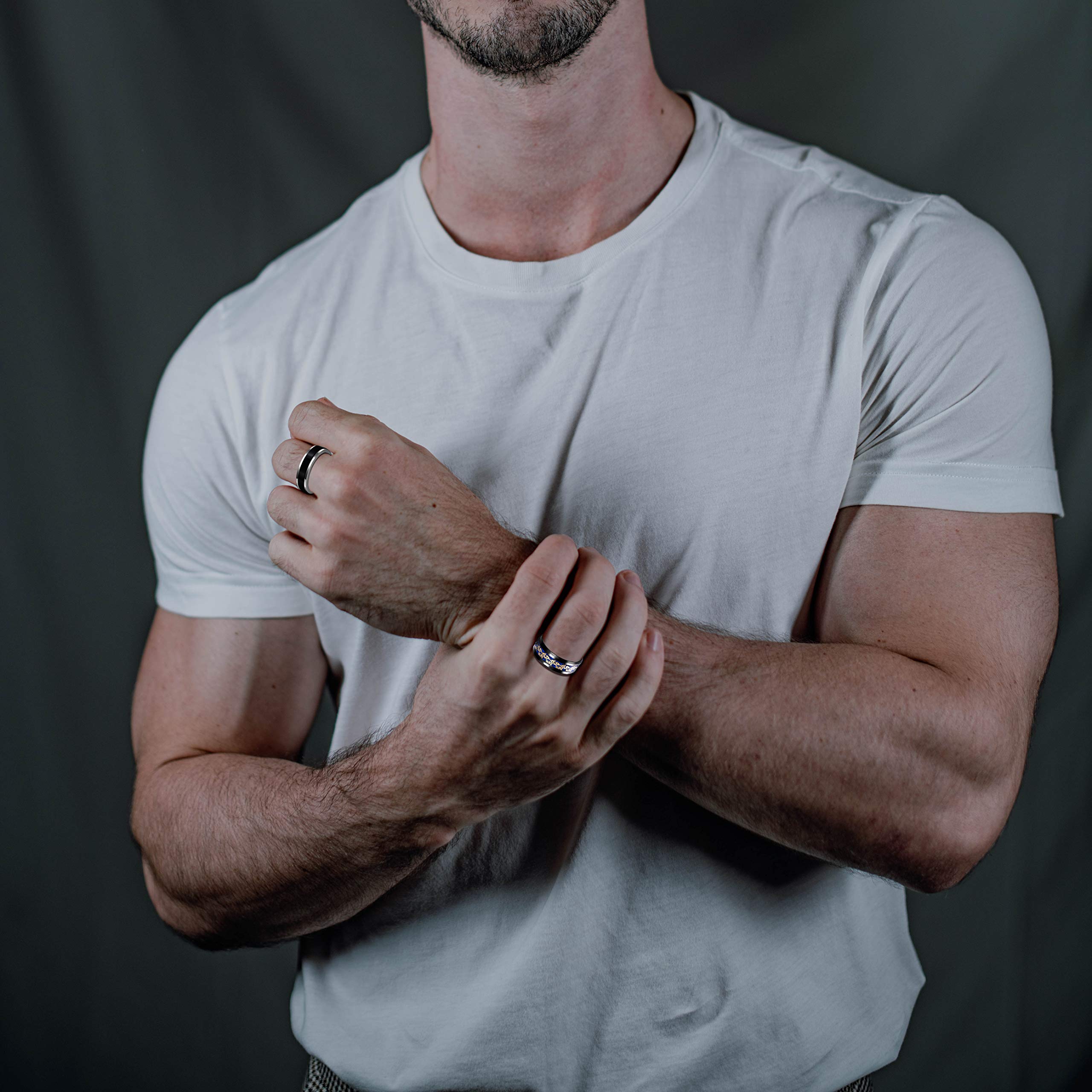 COOL RINGS: Fashion black band rings are perfect gift for men and women. Fairly low profile and spins easily, comfortable touch feeling. Various cool rings can match couple ring, wedding ring, engagement ring, distracting Ring, promise rings and everyday band ring