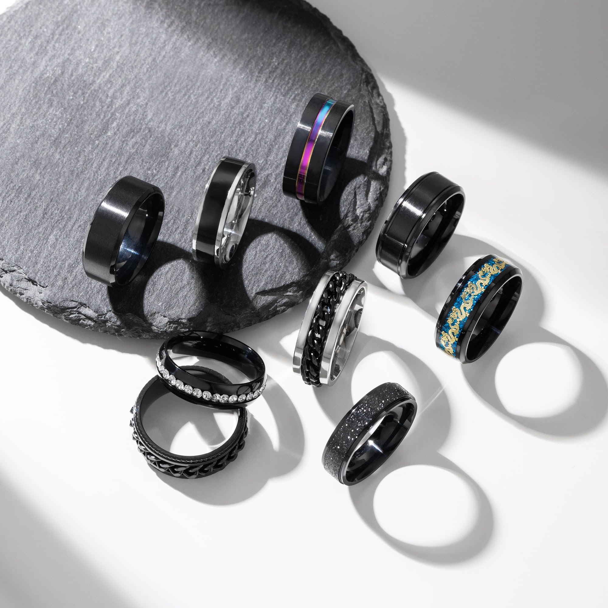 MENS RINGS SET: One order come with 9 pieces stainless steel band rings in various style, 1 pcs dragon pattern beveled edges ring, 2 pcs chain spinner rings, 2 pcs pure black ring, 1 pcs CZ ring, the other 3 pcs inlaid colored, smooth and frosted band. 7/8/9/10/11/12/13/14 ring sizes available, suit most men and women