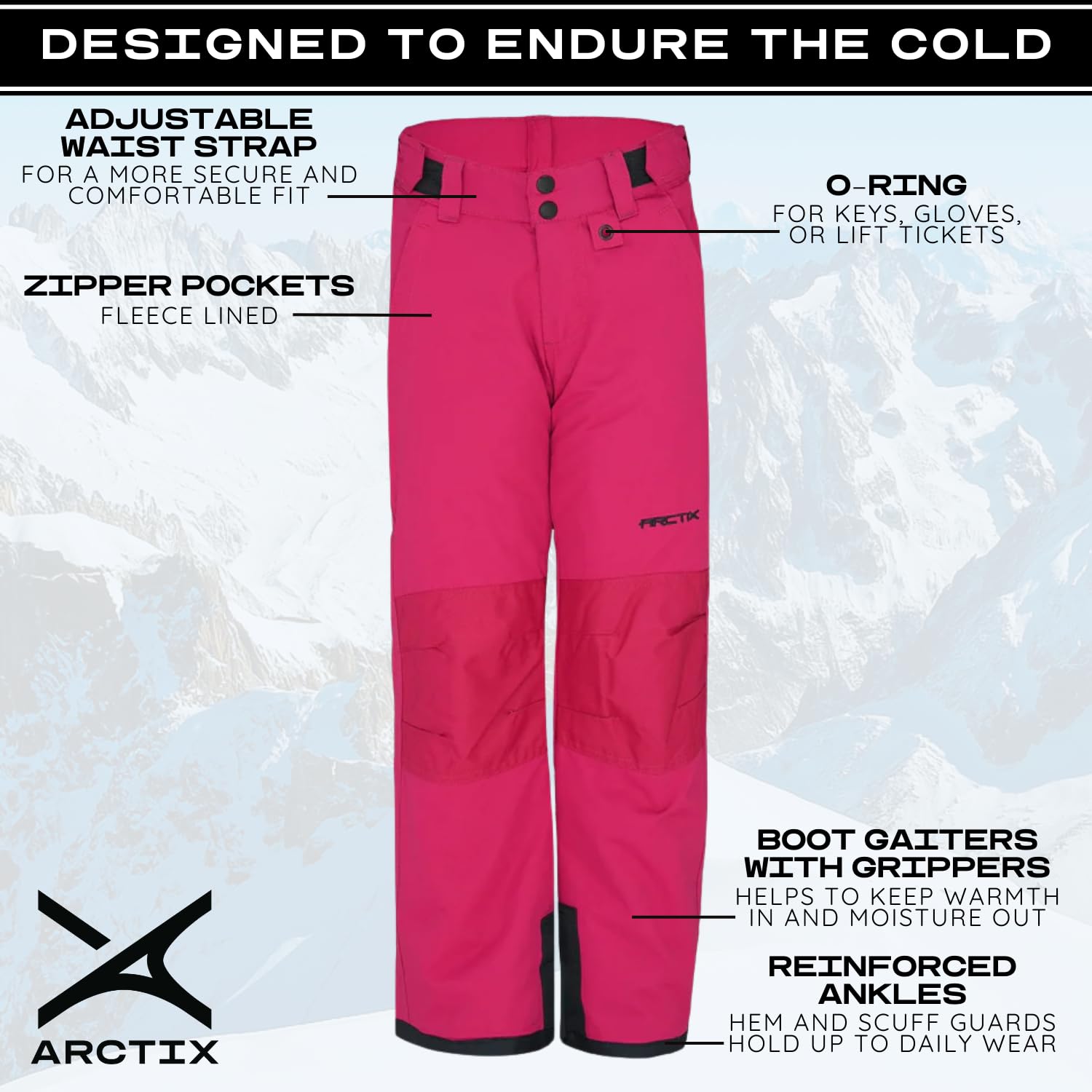 Description Season after season, the 1150 Arctix Youth Snow Pants with Reinforced Knees and Seat serve as an outstanding value priced ski/snow pants. These pants feature a 100% polyester dobby ThermaLock shell with a 210T polyester taffeta lining for added strength W/R + W/P 3000mm Coating, offering a maximum degree of durability and protection from the elements. 85 grams ThermaTech Insulation offers warmth in a lightweight, low bulk garment, keeping you warm at temperatures from -20° to +35° depending on your level of activity. DWR finish (Durable Water Repellent) helps repel water from fabric surface. The adjustable waist ensures a comfortable fit, while Boot Gaiters with Grippers form a seamless integration with the boots to keep the warmth in, and the moisture out. These relaxed fit pants also include 600 Denier Ballistic reinforced seat, knees, ankle, scuff and hem guards to hold up against daily wear & tear, and conveniently has an O-ring for keys, gloves and/or lift tickets. The pants provide zippered hand warmer style pockets, a zippered fly, and belt loops. They are water and wind resistant, and are machine washable.