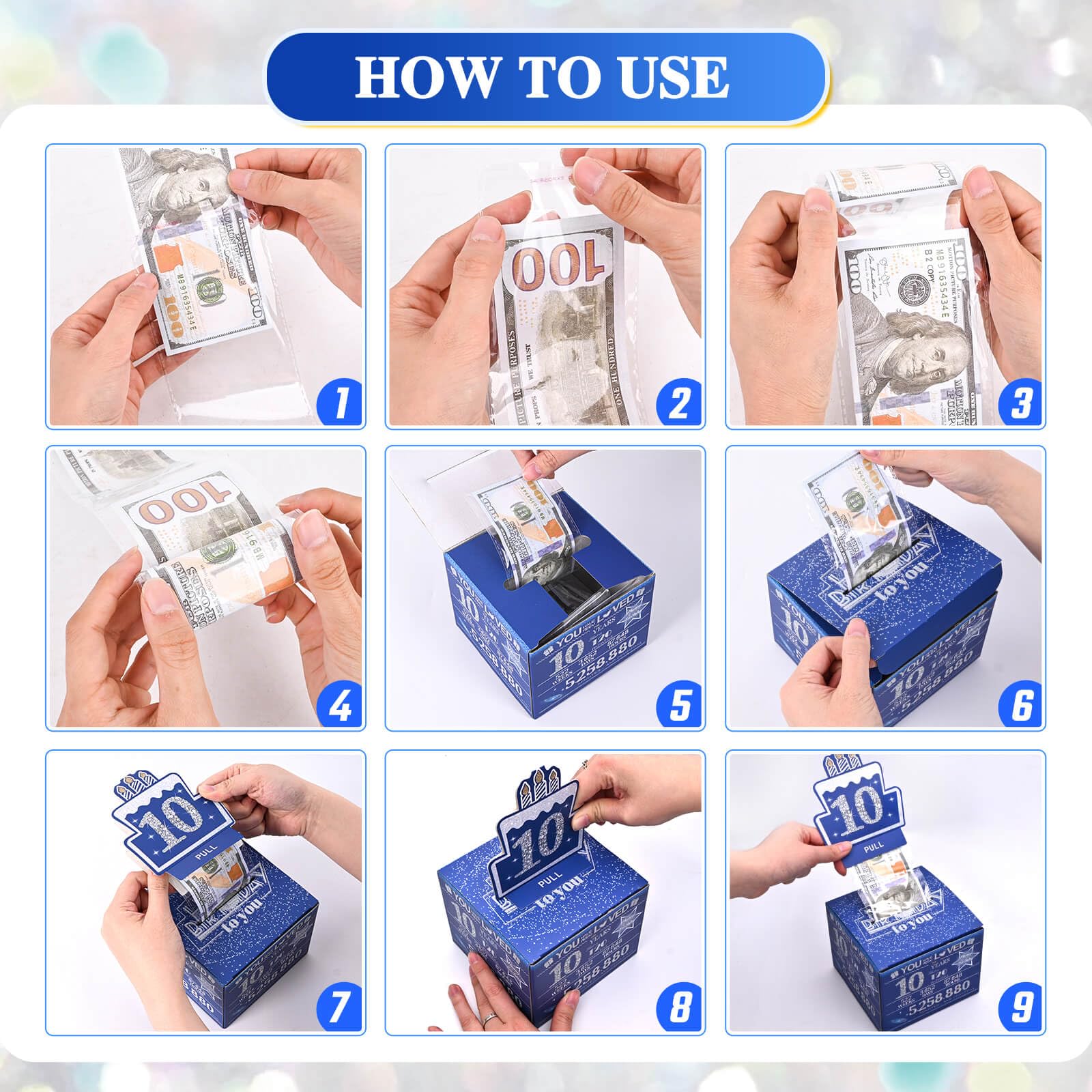 10 year old boy birthday gift Easy to Assemble : First, put the money in a plastic bag. Second, paste the plastic bag together. Third, roll up the money, put it in the box, and pull out one end of the plastic bag from the drawer slot to paste it with the birthday cake card. then One pull and the money will flow out.