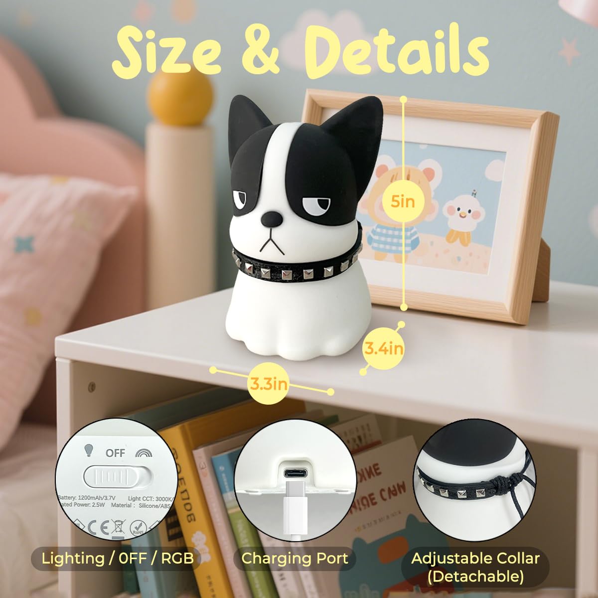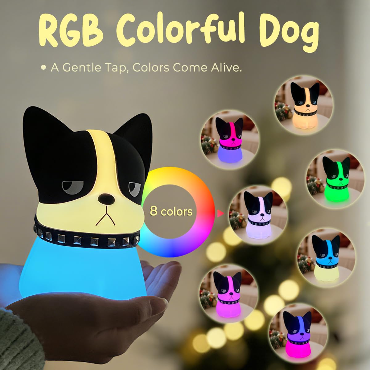 This BPA-free, food-grade silicone Dog night light is 100% safe for babies, toddlers & kids—soft, comfortable touch makes it a huggable companion! USB rechargeable with 1200mAh battery: 2hrs charge for 20hrs use, plus timer function, perfect for travel. TAP! SQUISH! FUN! Gentle tap controls 7 rainbow hues (smooth transitions thrill kids) & 3 brightness levels—50% soft glow for nursery sleep, 100% for midnight feedings/diaper changes, eye-friendly all the way. Soothing light calms fussy babies, chases nightmares, guards little ones nightly. Symbolizing serenity & hope, this kawaii Dog doubles as nursery/bedroom decor, ideal baby shower gift for daughters, granddaughters—grab this versatile present now!
