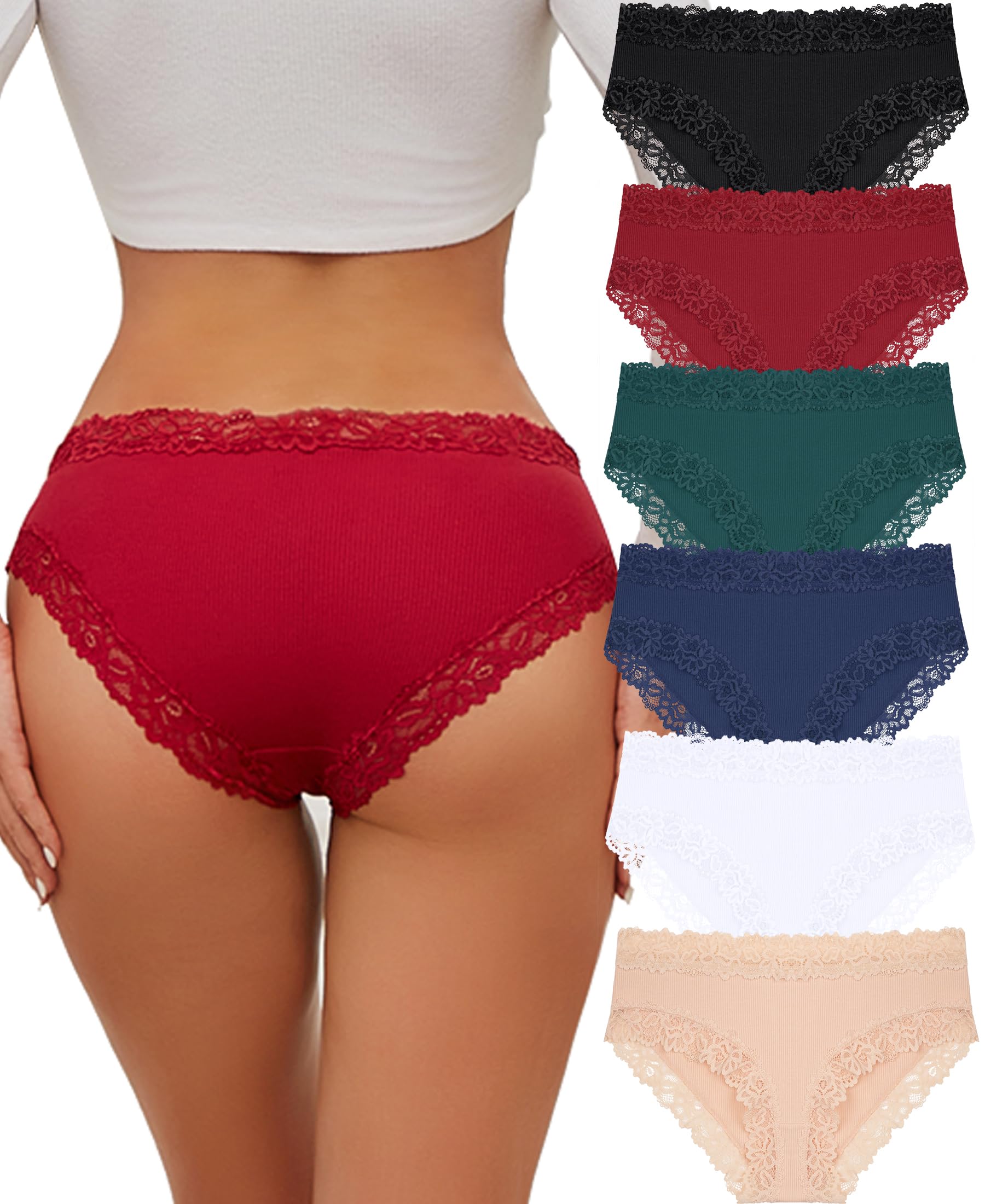 Cotton Underwear for Women : The panties made by 95% PREMIUM COTTON, 5% spandex. Crotch inner lining: 100% cotton. Comfortable and breathable fabric skin-friendly; Super cute Lace waist, great for girl and mommy, 6 pack lovely set of colors, great for everyday wear.
