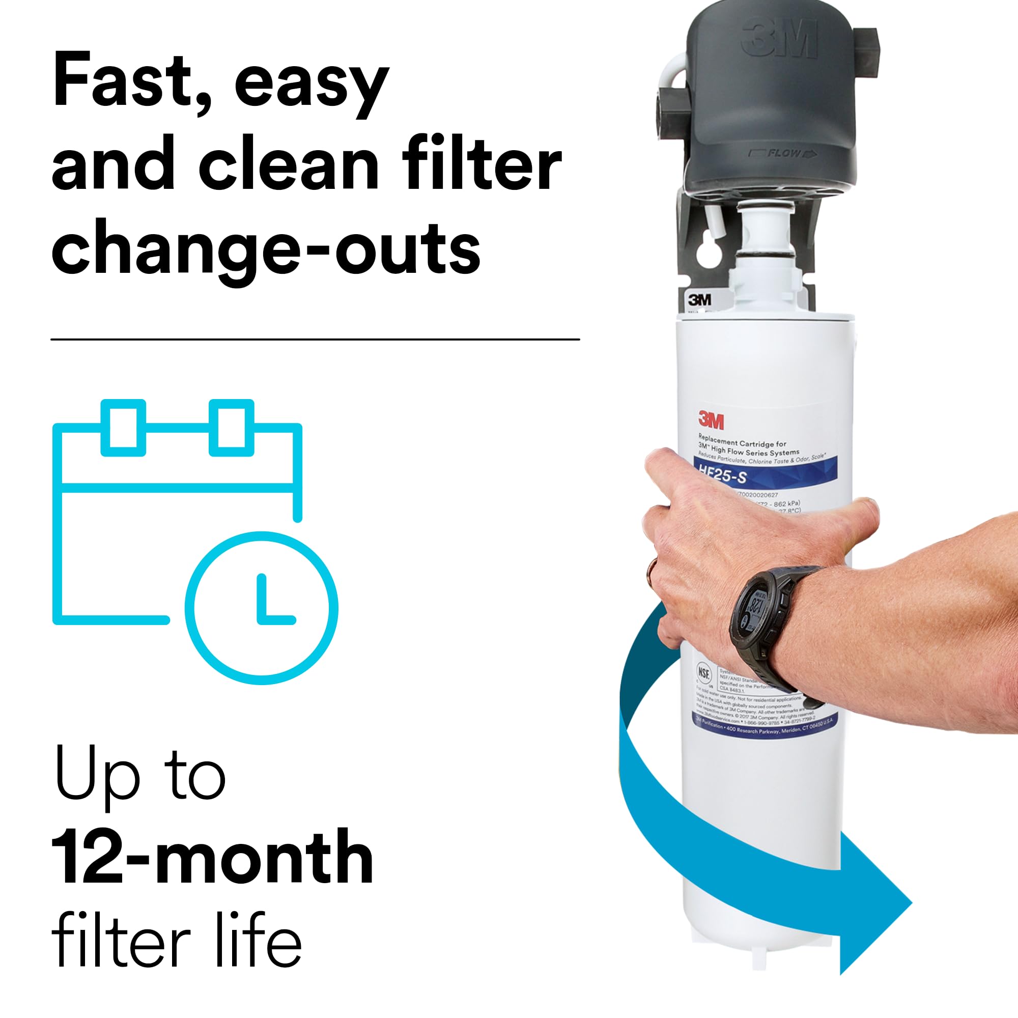 The 3M High Flow Series System for Ice Applications featuring Valve-in-Head Design, Model ICE125-S provides consistent quality water by reducing particulate*, chlorine taste and odor, and scale*. The Sanitary Quick Change (SQC) design allows for easy cartridge change-outs. This system is designed for use in ice applications.
