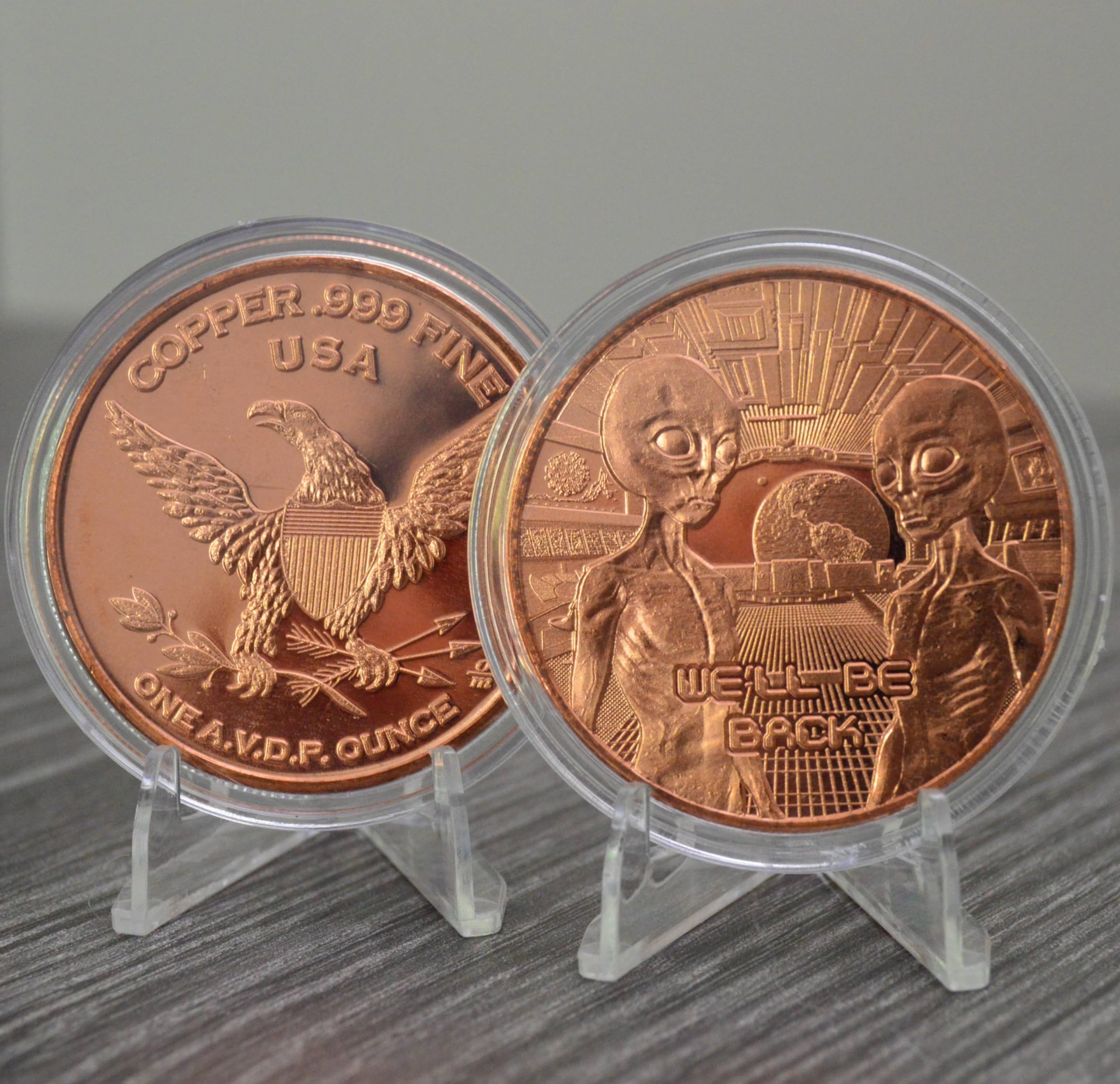 Introducing the 'We'll Be Back' Aliens 1 oz Pure .999 Copper Round Bullion Coin—a fascinating and whimsical addition that will pique the interest of collectors, investors, and sci-fi enthusiasts alike. The coin's striking design features two extraterrestrial beings in a spaceship, departing Earth, with a message that tickles the imagination: 'We'll Be Back.' Crafted as a nod to the public's enduring fascination with life beyond Earth, this coin adds an element of fun and wonder to any collection. Expertly minted in the United States from 99.9% pure copper, this 1 AVDP ounce round measures an impressive 39mm in diameter. When secured in its protective capsule, the overall dimensions extend to 45mm, ensuring the design's intricate details and radiant luster are well-preserved for future generations. Every coin comes with a Certificate of Authenticity (COA) by Heavenly Metals, confirming its 99.9% copper purity and origin. This provides a substantial level of assurance in the integrity and value of your investment. Whether it's a unique challenge coin, a captivating golf ball marker, or a collectible that intrigues fans of the extraterrestrial, this copper round makes an unforgettable gift. Secure your piece of imaginative artwork today and ponder the intriguing question: when will they be back?