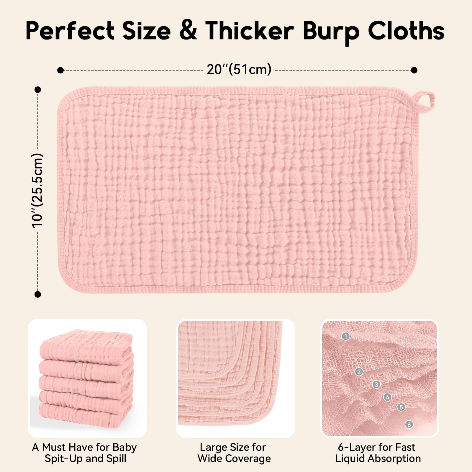 ❤Excellent Absorbent: Featuring 6 layers of absorbent muslin and fluffy structure design, our burping cloths for babies provide maximum absorption with tendor touch, works well to protect your teething baby from all dribble and spit ups soaking their clothes. Large 20''X10'' size provides maximum coverage and extra layering adds durability, making them ideal for use in any season.