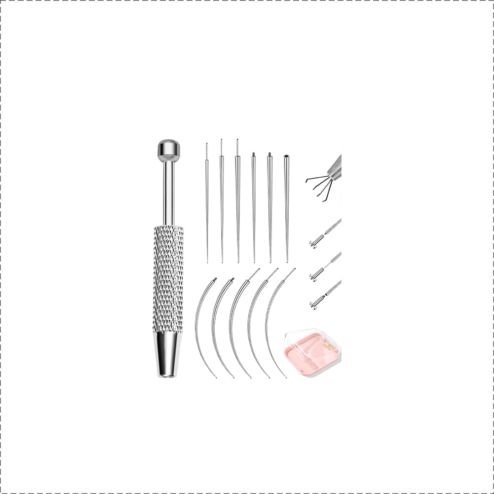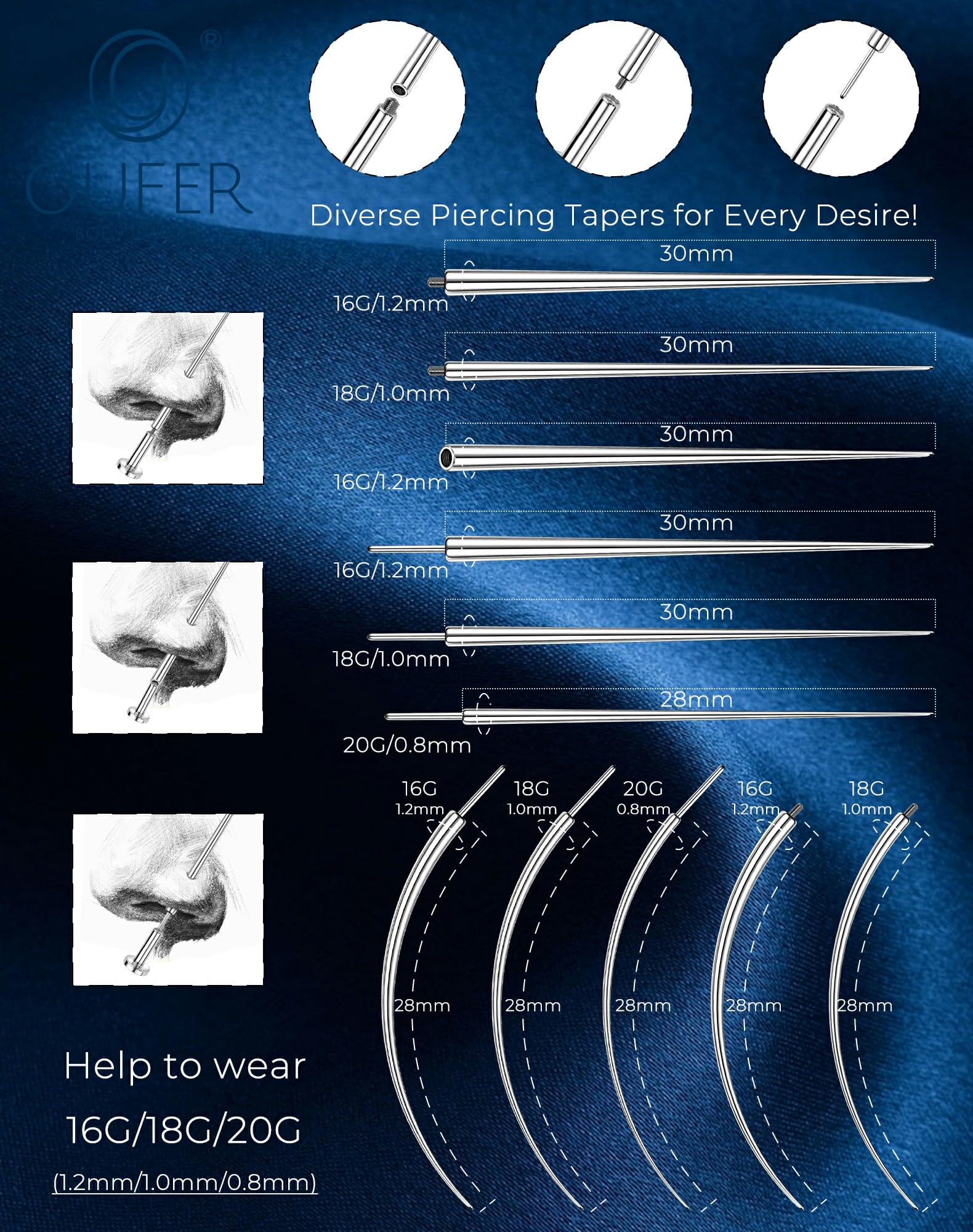 [Best Combination] This product Total 12PC sincludes 1PC Piercing Ball Grabber, 11PC 16G/18G/20G Internally Threaded Push Pin External Thread Piercing Guide needle Tool, This is a must have for someone with multiple piercings, or who has long fingernails. The tapers are perfect for helping you put flat back or twist on piercing jewelry in your ear or nose.The little grabber tool is a game changer for taking earrings on and off.