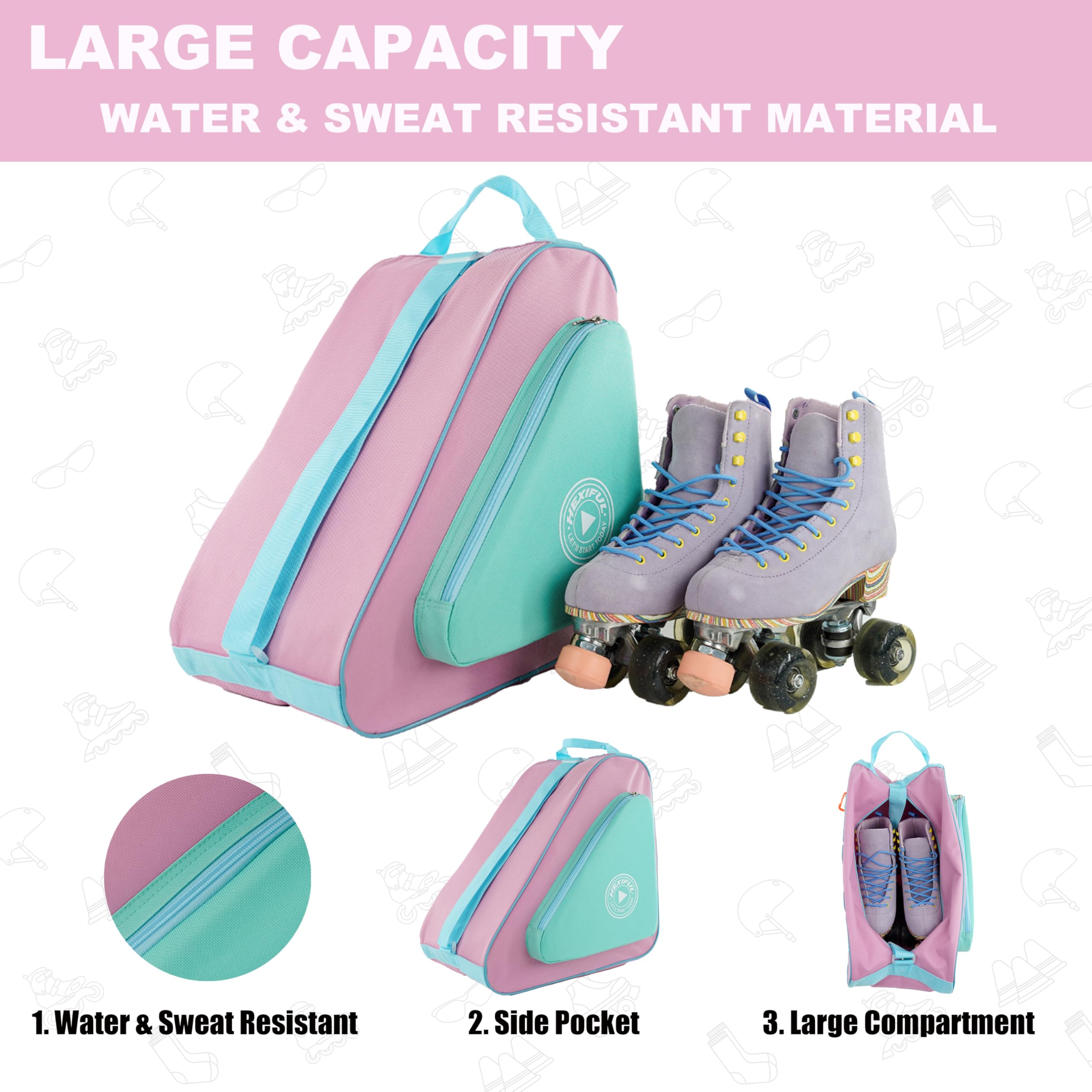 High Capacity—Large main compartment can hold most of skates with helmet at the same time. Large back pocket can hold protected gears, sportswear and drinks etc.
