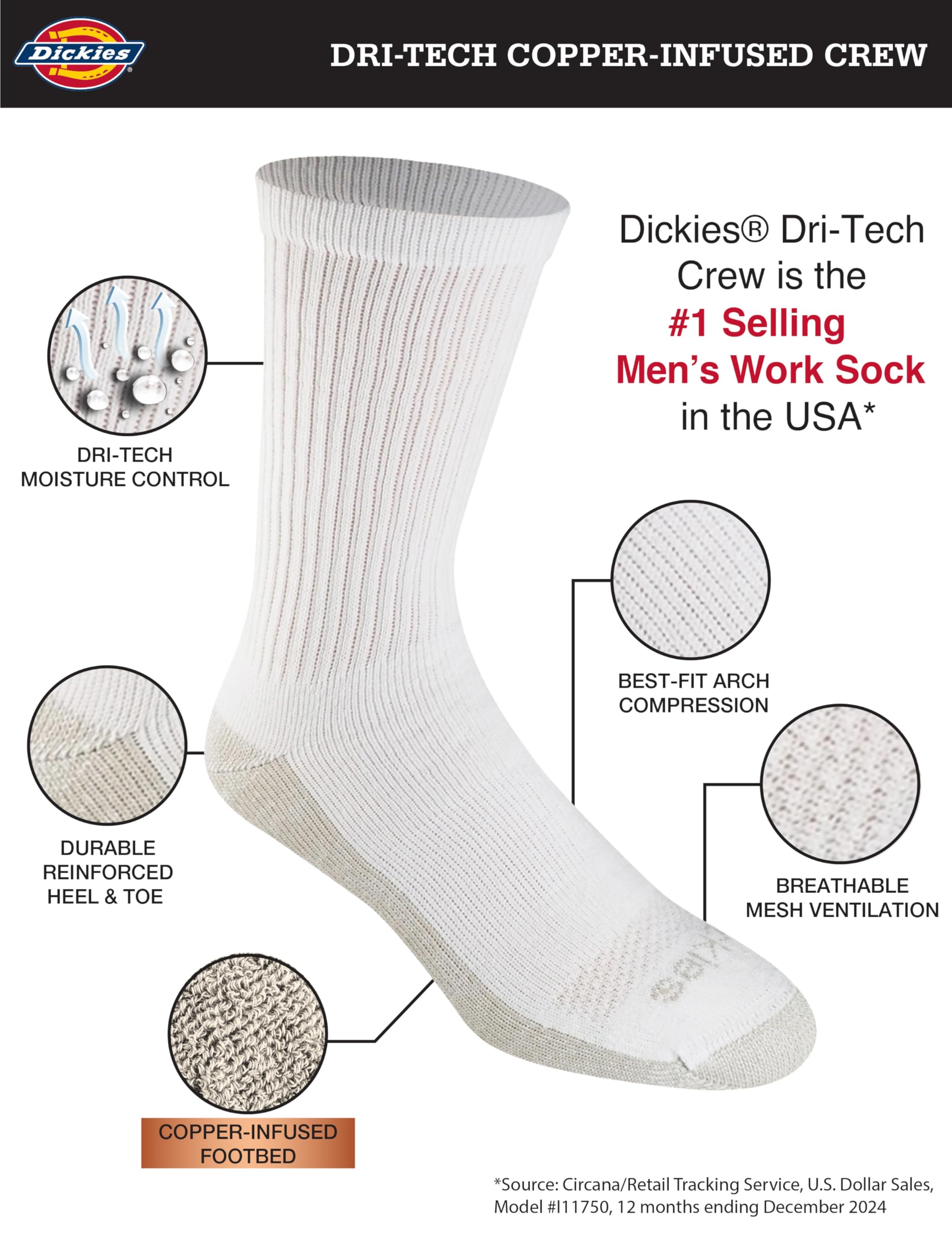 Description Dickies dri-tech comfort 6 Pairs crew with wicking, moisture management fibers keeps feet dry, ventilation channels engineered for air circulation and moisture control, arch compression hugs feet and keeps socks in place, while providing in-step support, Reciprocated heel and toe for superior fit and full cushion comfort