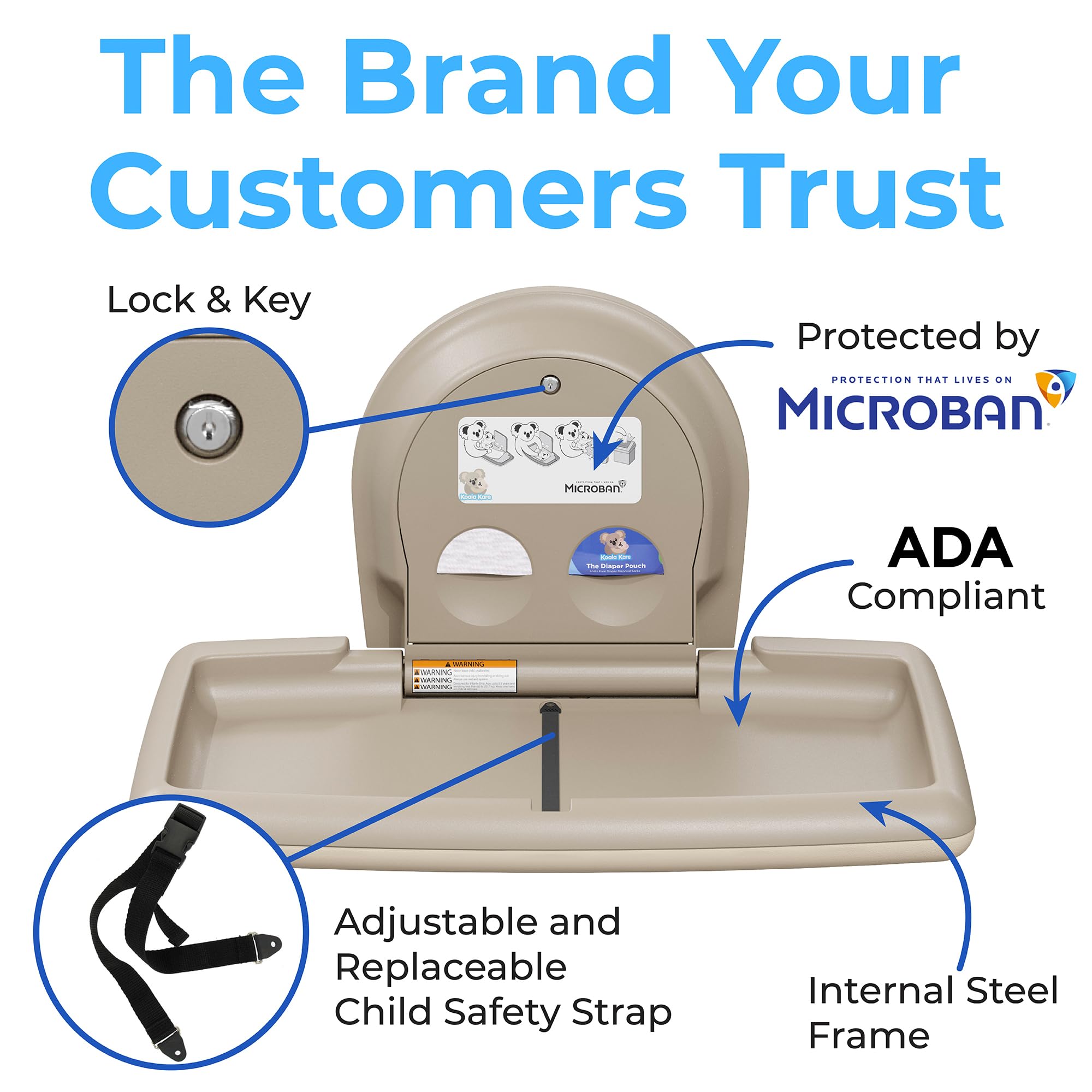 Elevate your establishment's family-friendliness with the Koala Kare KB300 Baby Changing Station. Merging durability with design, this surface-mounted, horizontal changing station is an embodiment of strength and convenience for your customers. This premium diaper changing station is built with polypropylene plastic and an internal steel frame for strength. Available in Beige, Grey, and White Granite with a contrasting outer ring, it complements any decor, adding a modern touch to your restrooms. Microban product protection is built into the bed surface to promote hygiene by reducing odor-causing bacteria. The built-in dispensers provide users easy access to sanitary bed liners and diaper disposal sacks. It also has a lock to minimize refills and deter vandalism. Child protection straps keep little ones secure, and a concealed pneumatic cylinder provides controlled, slow opening and closing of the changing station bed. Meets ADA and ASTM requirements when mounted properly. When you choose Koala Kare, you are choosing safety, style, durability, and decades of family accommodation expertise.