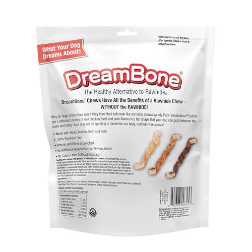 DreamBone® chews have all the benefits of a rawhide chew…without the rawhide! No-rawhide DreamBone chews are made with real chicken, beef, bacon and cheese or sweet potato and wholesome vegetables for a scrumptious taste dogs can’t resist! Why do dogs chase their tails? They think their tails look like our tasty DreamBone® Spirals Variety Pack! DreamBone Spirals are a delicious combination of real chicken, beef and pork in a fun shape that your dog can grab between the paws and enjoy. These 100% rawhide-free, vitamin and mineral-enriched chews support a healthy skin and coat for your dog. Your dog will be spiraling in circles for our tasty, rawhide-free spirals! Feed your pup 1 to 2 chews per day and always supervise your pet during chewing activity. DreamBone Spirals are what your dog dreams about!
