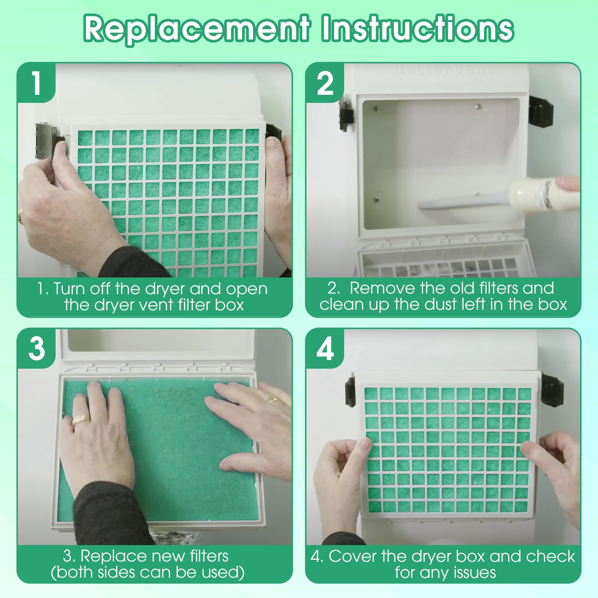 Easy to Install: no more drilling holes or navigating complex installations; Open dryer vent filter box, remove the old filters (if applicable, and both side of the filter replacements can be positioned), replace and secure new filters, cover the box and check for any issues