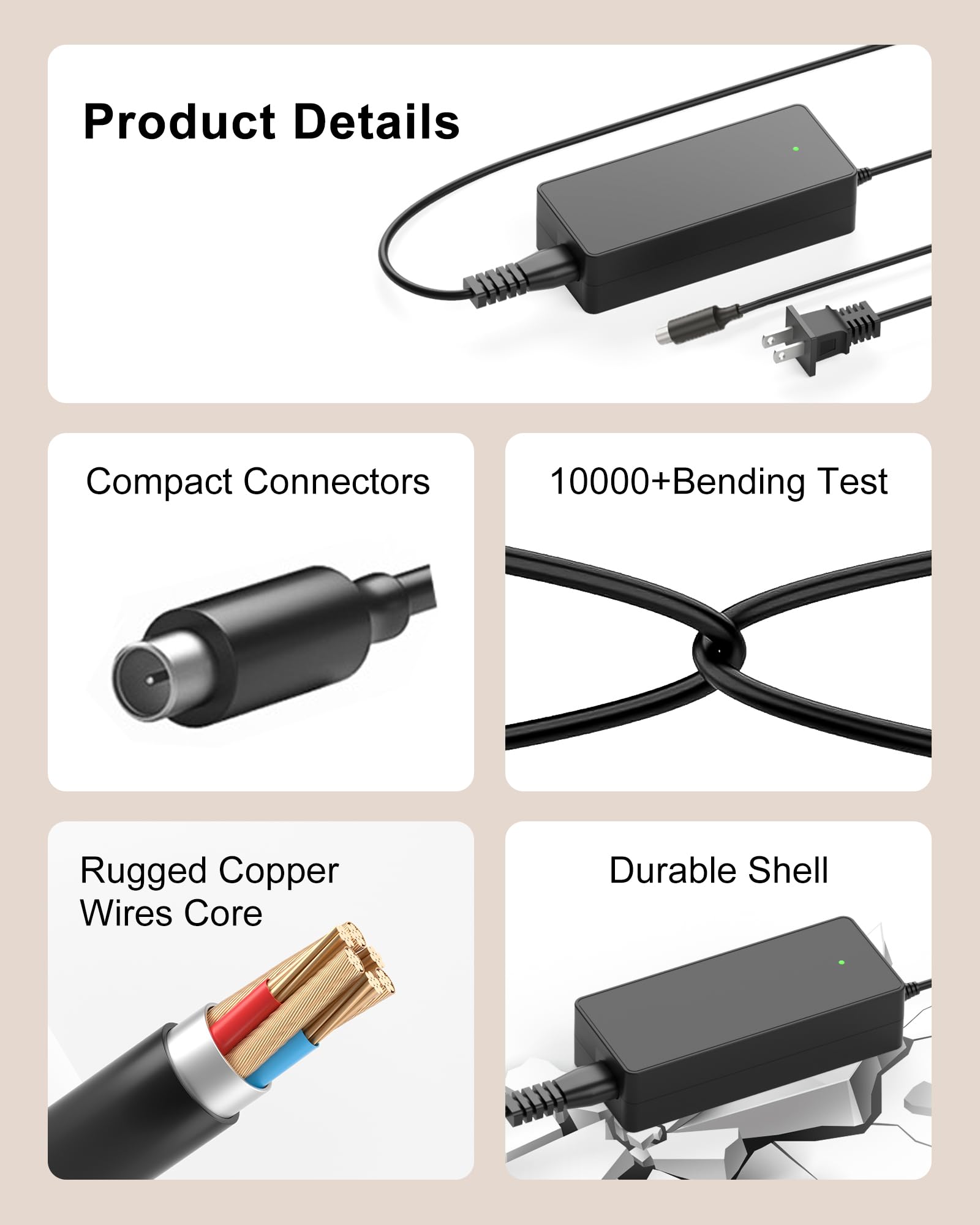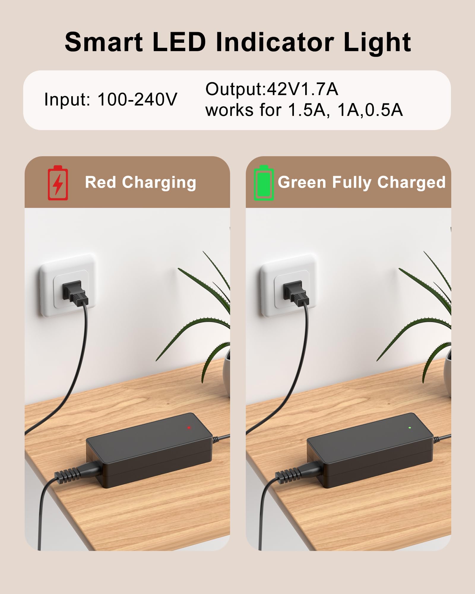 Input: AC 100–240V 50/60Hz; Output: 42V2A (works for 1.75A 1.5A, 1A,0.5A); Cable length: 10FT/3M.