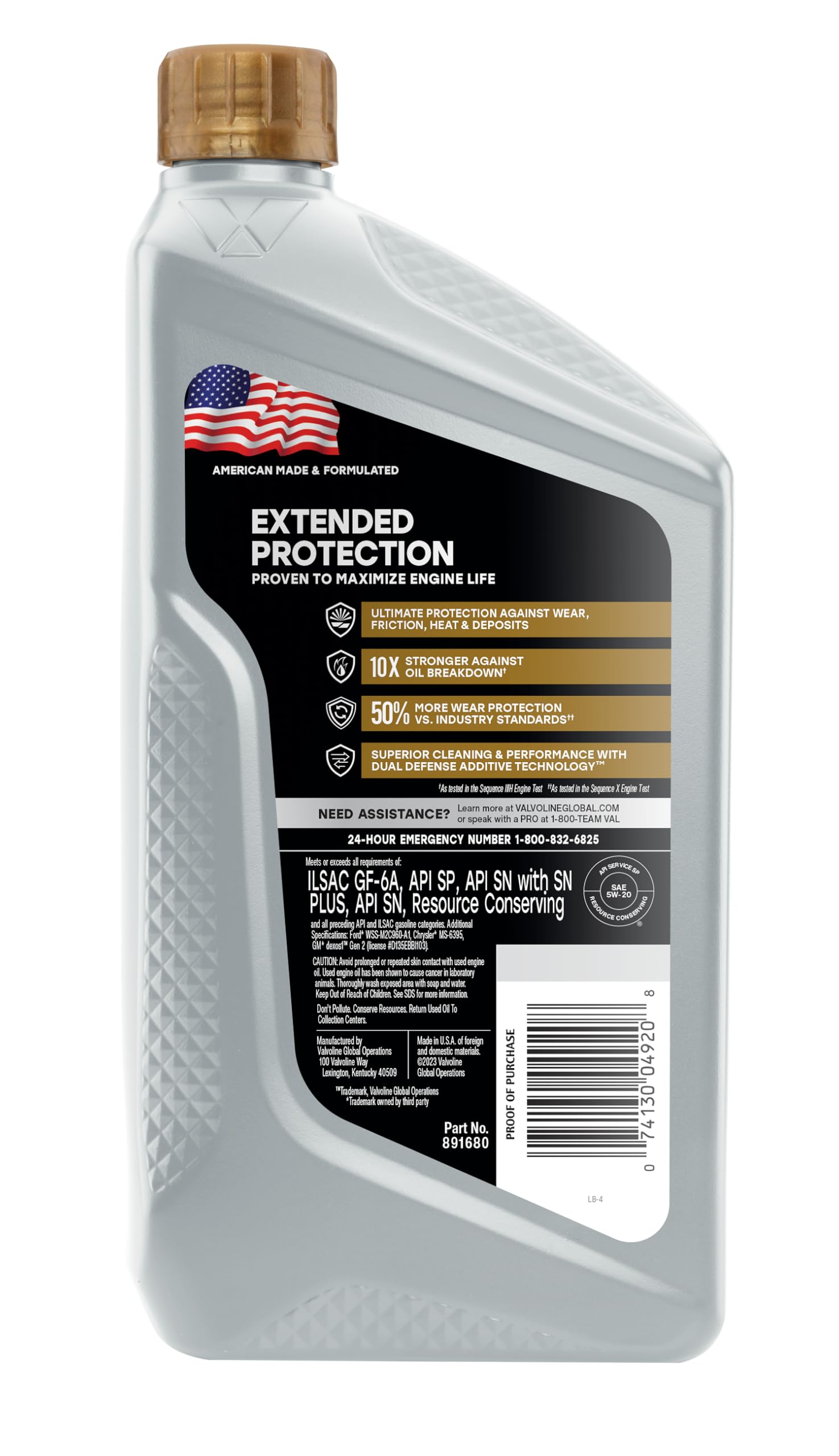Premium motor oil isn’t just for sports cars or luxury vehicles. Today’s engines produce more horsepower in a smaller package to improve fuel efficiency without sacrificing performance. Because engines are working harder, they demand next-level protection. Valvoline Extended Protection Full Synthetic Motor Oil provides superior protection from deposits, wear, heat and friction – the four major causes of engine breakdown. Our Dual Defense Additive Technology combines an innovative additive booster with a fortified detergent system to fight sludge and help keep engines clean for optimal performance and fuel efficiency. Valvoline Extended Protection Full Synthetic is 10x stronger against oil breakdown and offers 24x stronger protection against engine-killing contaminants than the industry-leading full synthetic. And thanks to an exceptional range of temperature protection, your engine will be ready for extreme summer heat or frigid winter weather. Formulated to exceed the latest industry engine oil specifications (API SP, ILSAC GF-6 and GM dexos1), Valvoline Extended Protection Full Synthetic is our best oil, and your best choice, whether you drive a Toyota Camry, Ford F150, Chevy Silverado or anything in between.