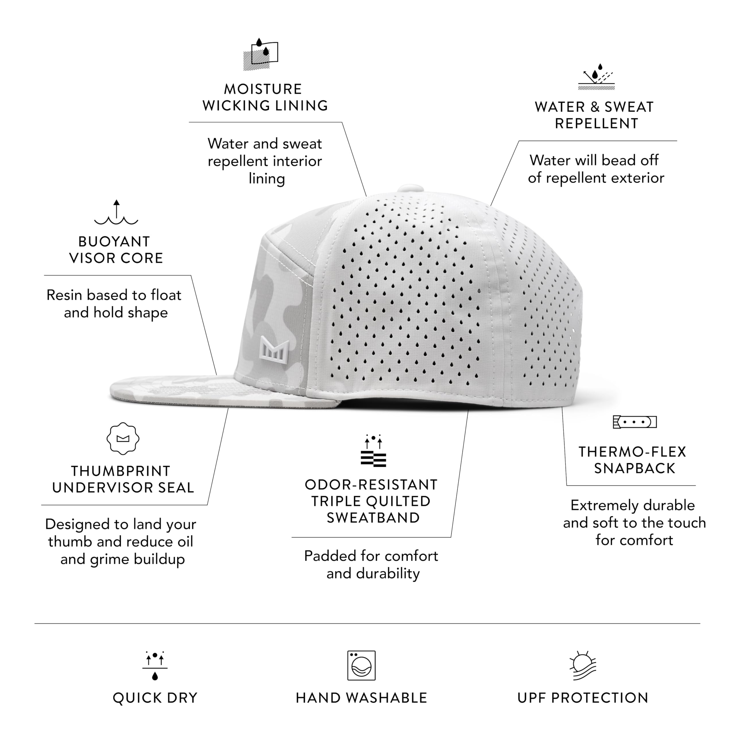 PERFORMANCE SNAPBACK HAT: Exterior crown has hydrophobic crown panels, laser-perforated side & rear panels for breathability, and custom soft touch snapback closure. Visor has hydrophobic exterior, water capable core, and signature under visor seal