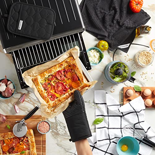 Made of insulated, heat resistant cotton, this oven mitt and pot holder set protects hands, forearms, and countertops from heat while cooking and baking