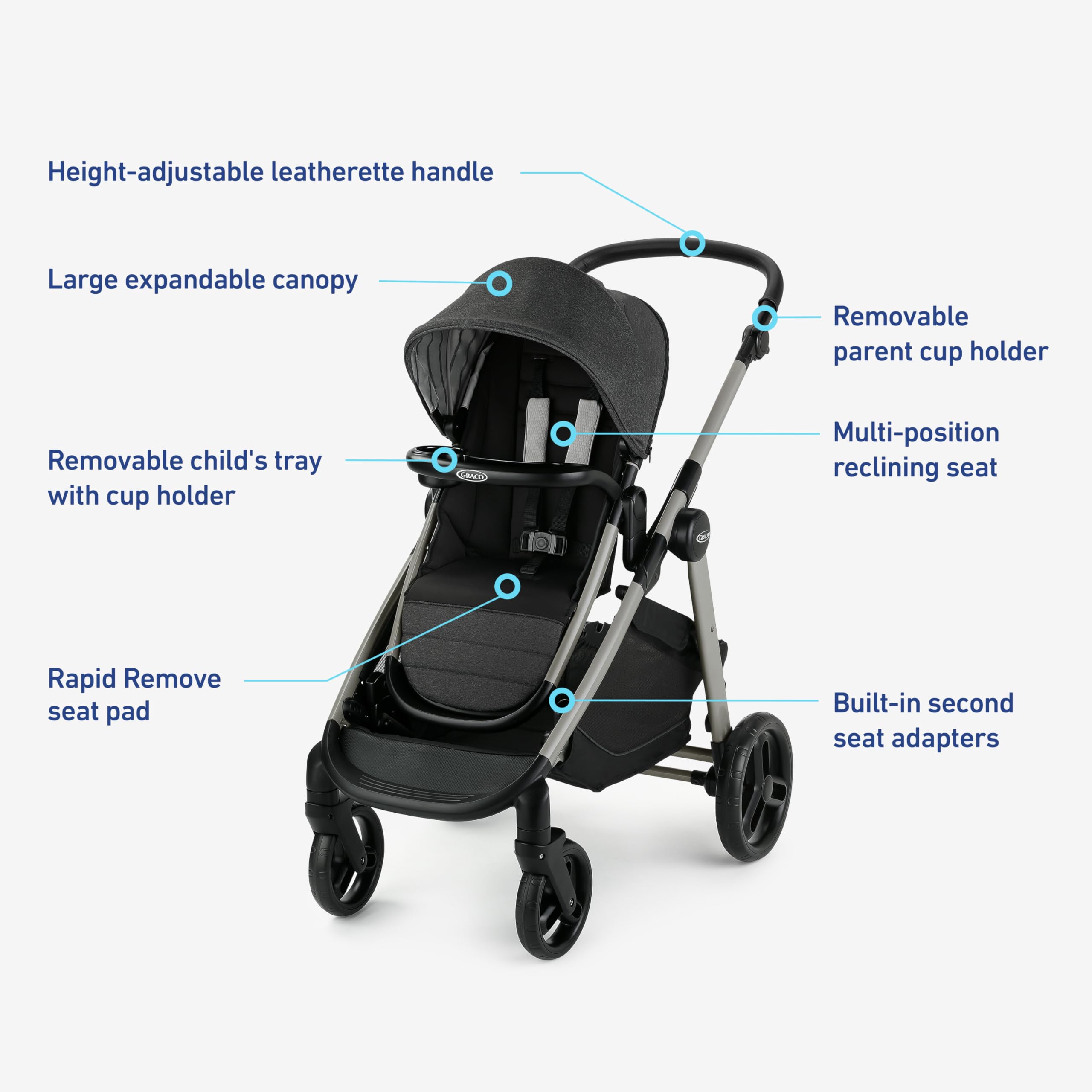The Gracoยฎ Modesโข Nest2Growโข Stroller grows from a single to double stroller with the addition of an infant car seat, carry cot, or second seat (each sold separately), for 15+ ways to ride. It's the only stroller you'll need for a growing family, but it's the size of a single stroller perfect for first-time parents, too. The Slide2Meโข height-adjustable seat has 3 height positions to bring baby closer while making extra room for the second seat when baby number two is on the way. The reversible seat can face parent or the world for so many different ways to stroll. The one-step, self-standing fold makes transport and storage easy. A multi-position reclining seat helps keep your little one comfortable. When converted to a double stroller with second seat (sold separately), streamlined stacked seating provides a similar view for both children and makes getting in and out easier. The removable child's tray with cup holder and removable parent cup holder keep drinks and snacks within reach. The expandable canopy has 2 positions for sun protection.