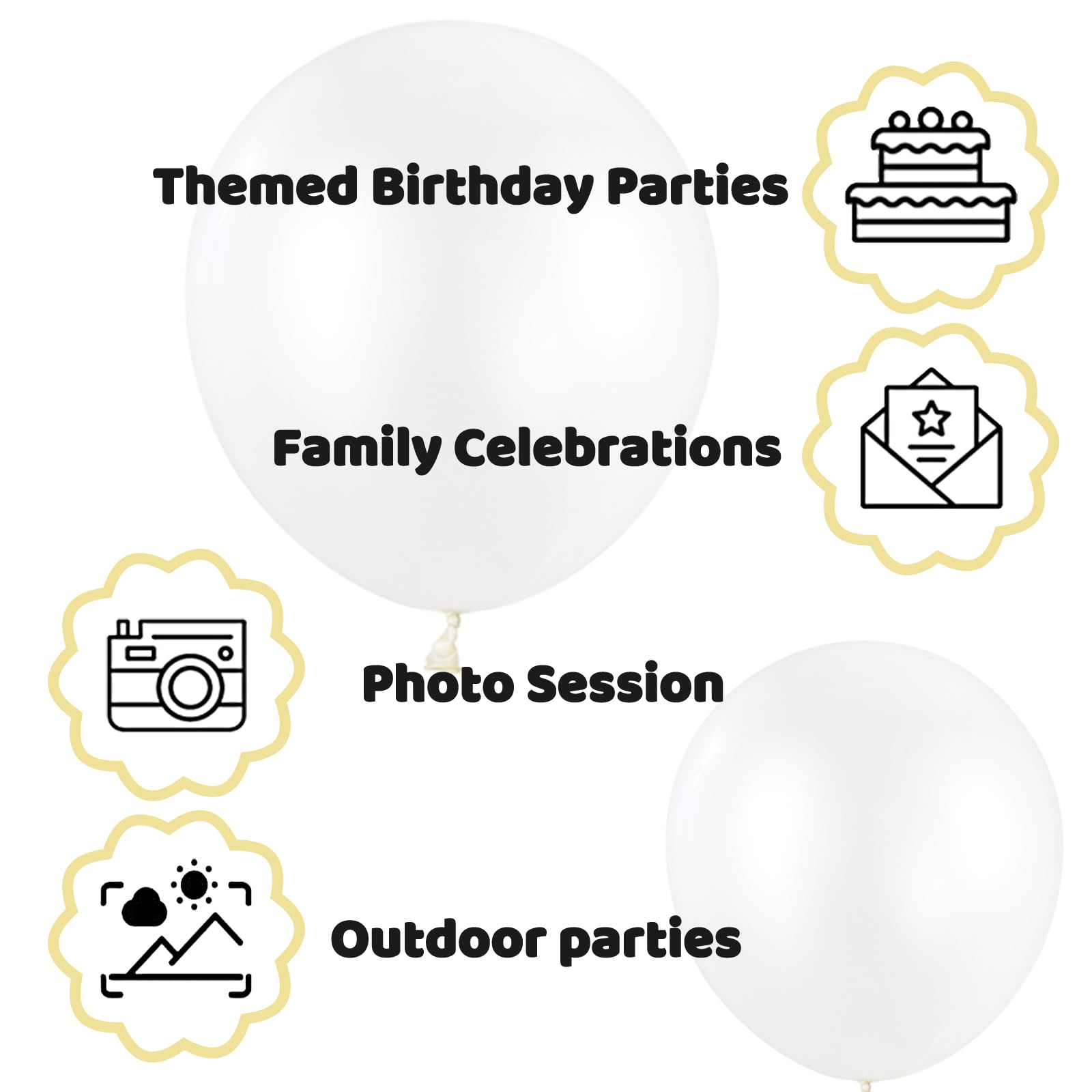 The 12 inch pearl white Latex Party Balloons included in the package can make your Party Decoration such as Birthday Party, Baby Shower,Wedding, Halloween or Christmas Party, etc. have enough pearl white Balloons to decorate.