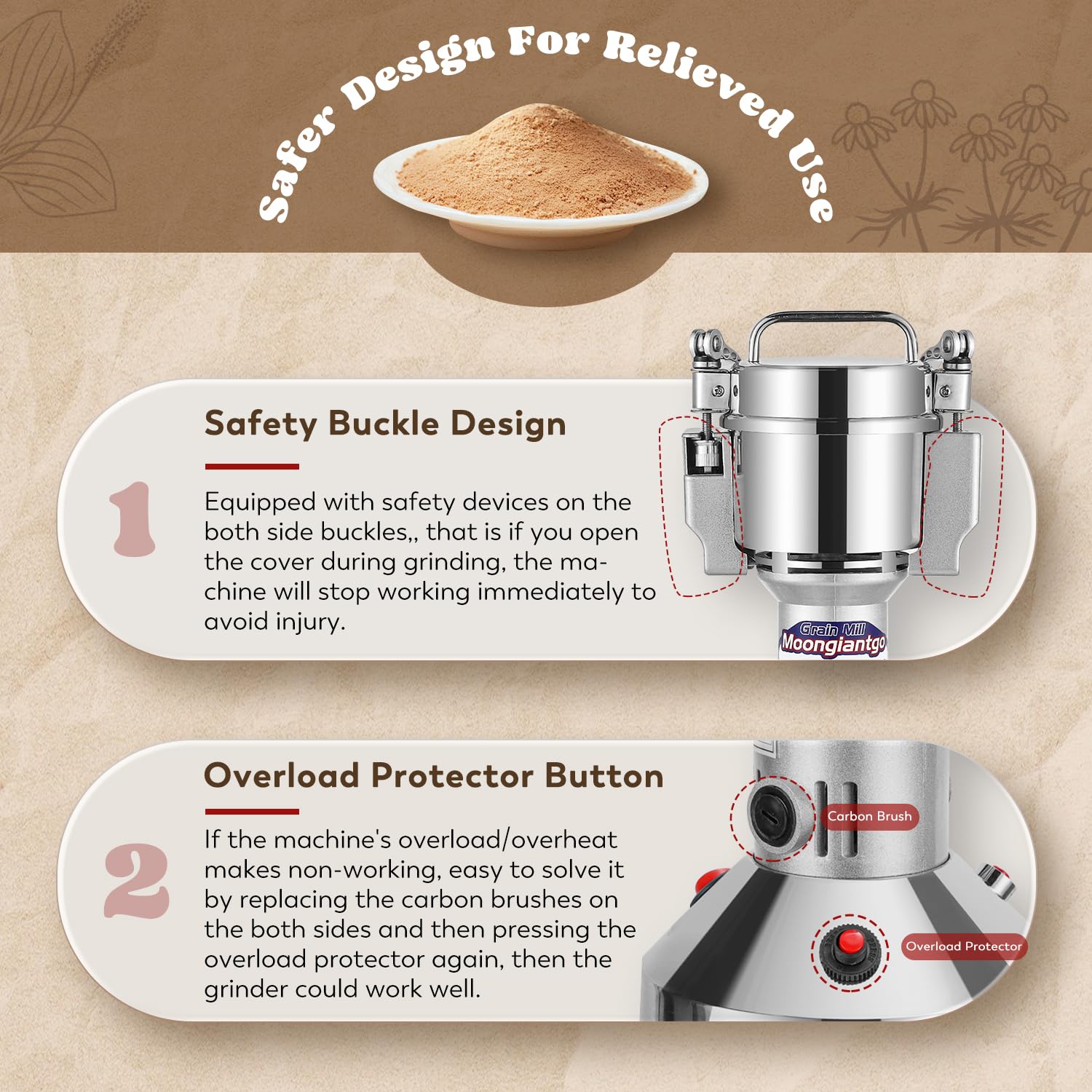 Safer Design For Relieved Use - Our electric grain grinder is equipped with safety buckles on the both sides, which will immediately stop the machine from working if you open it during grinding to prevent injury. And with upgraded overload protector, the grinder will stop working to prevent the motor burnout in cases of overload or overheating.