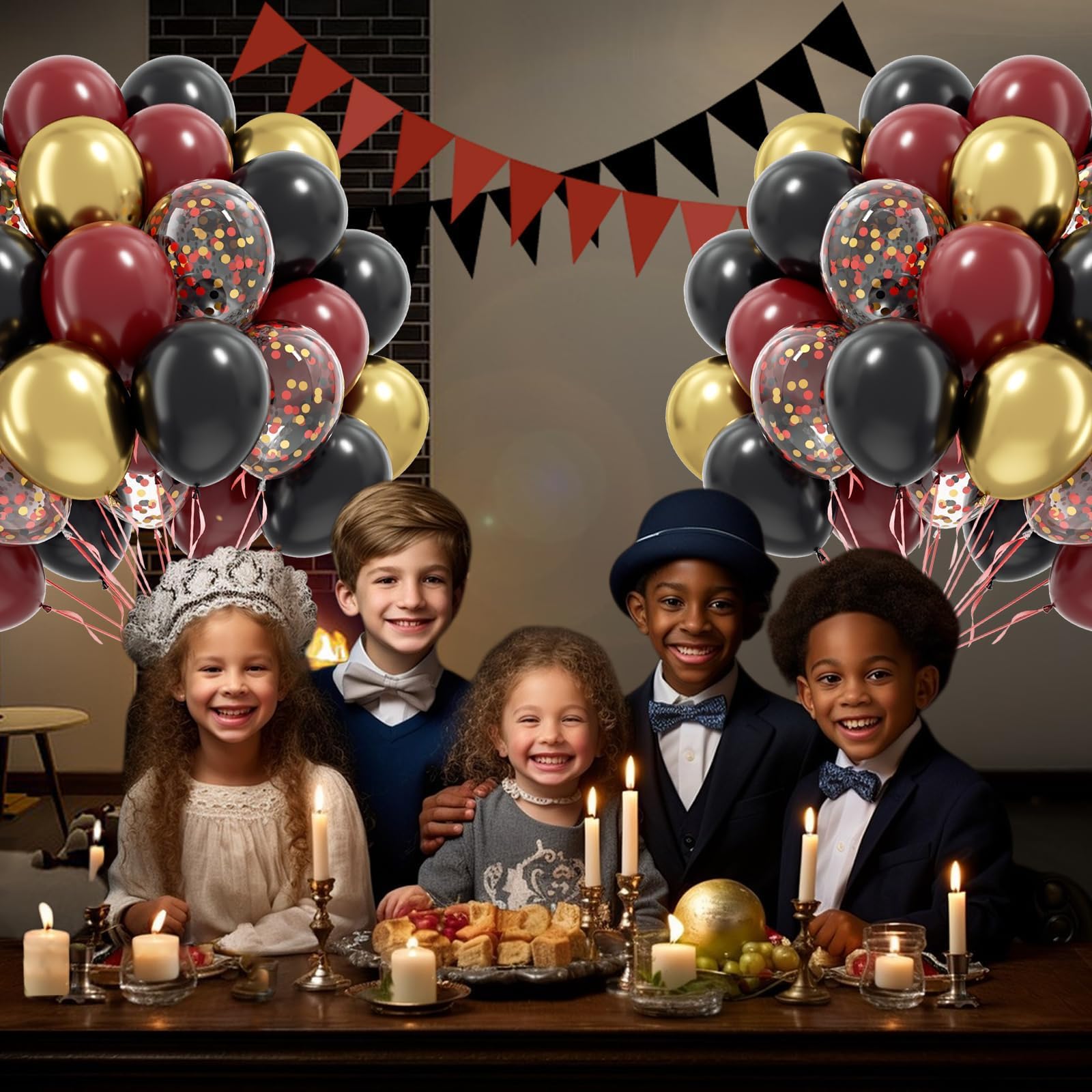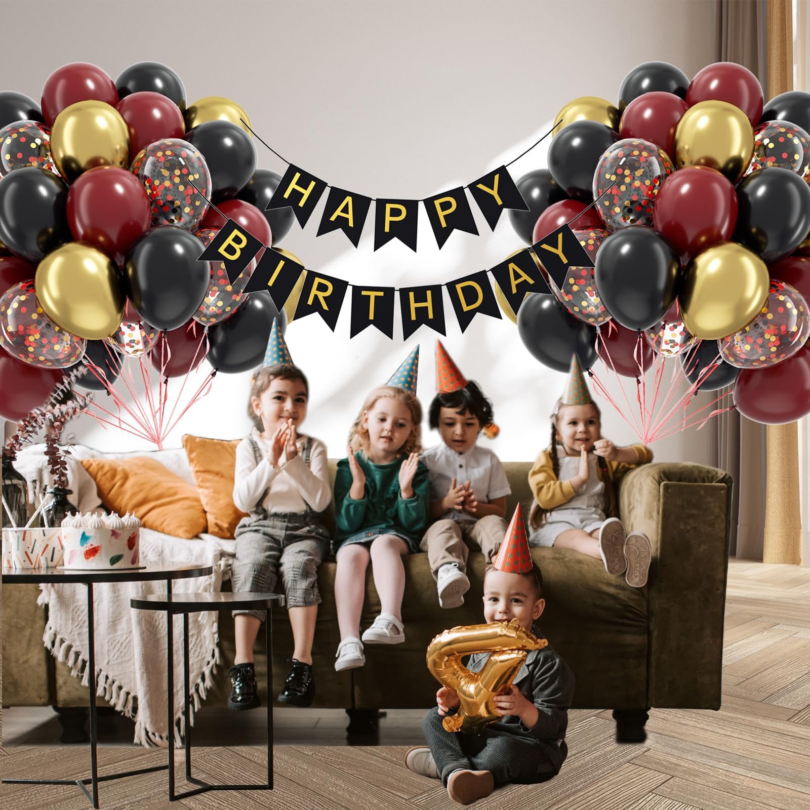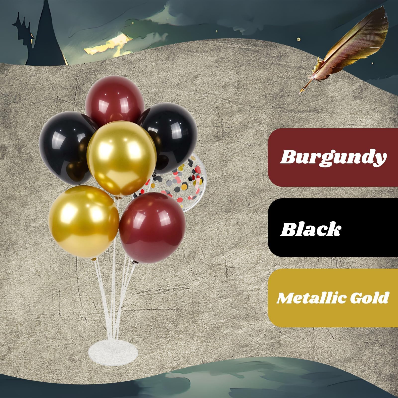 Package Include: The black burgundy and gold balloons included 12inch burgundy balloonsx20, 12inch black balloonsx20, 12inch metallic gold balloonsx10, 12inch black red gold confetti balloonsx10, glue dotx20, red ribbonx1, decorative stripx1