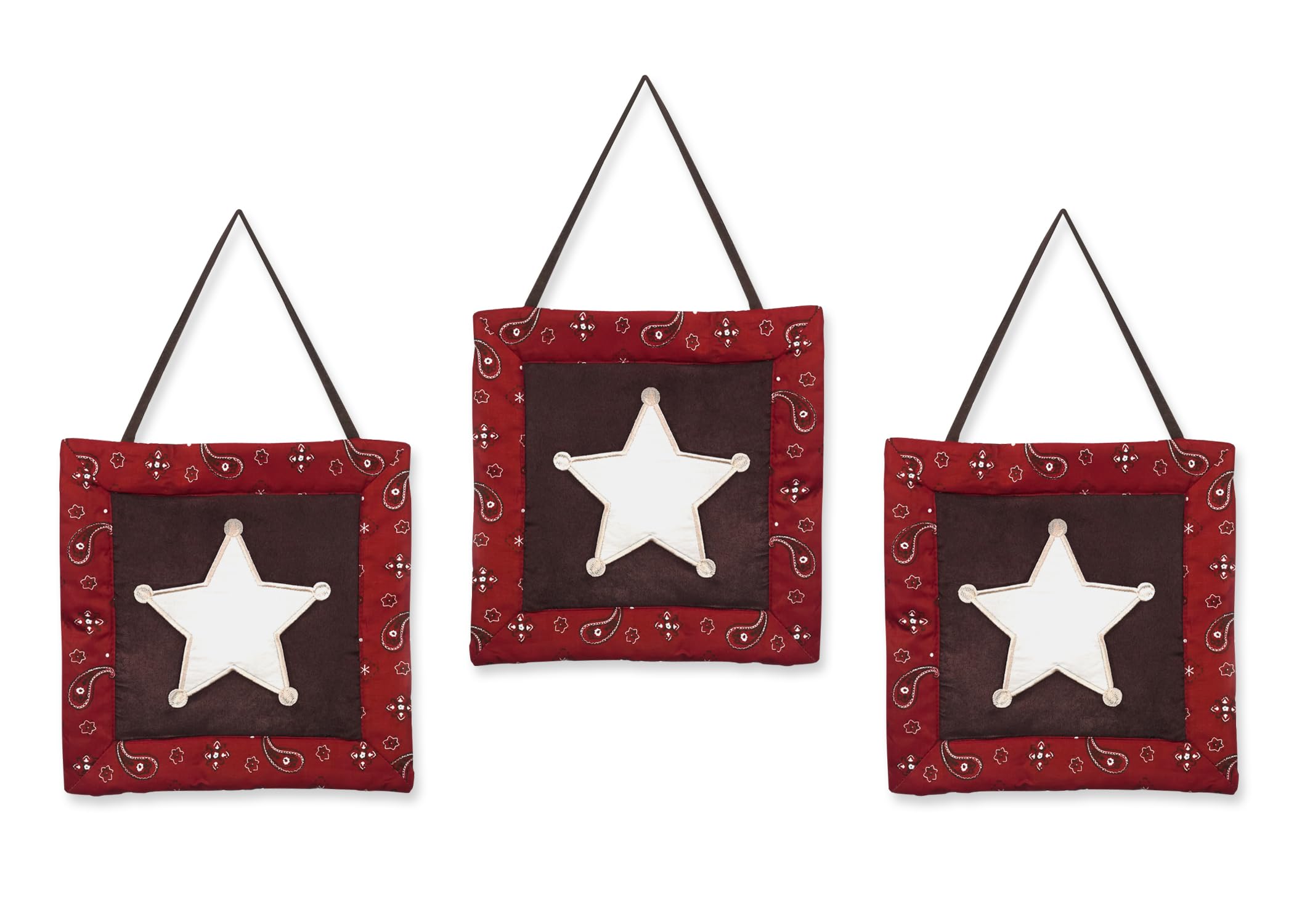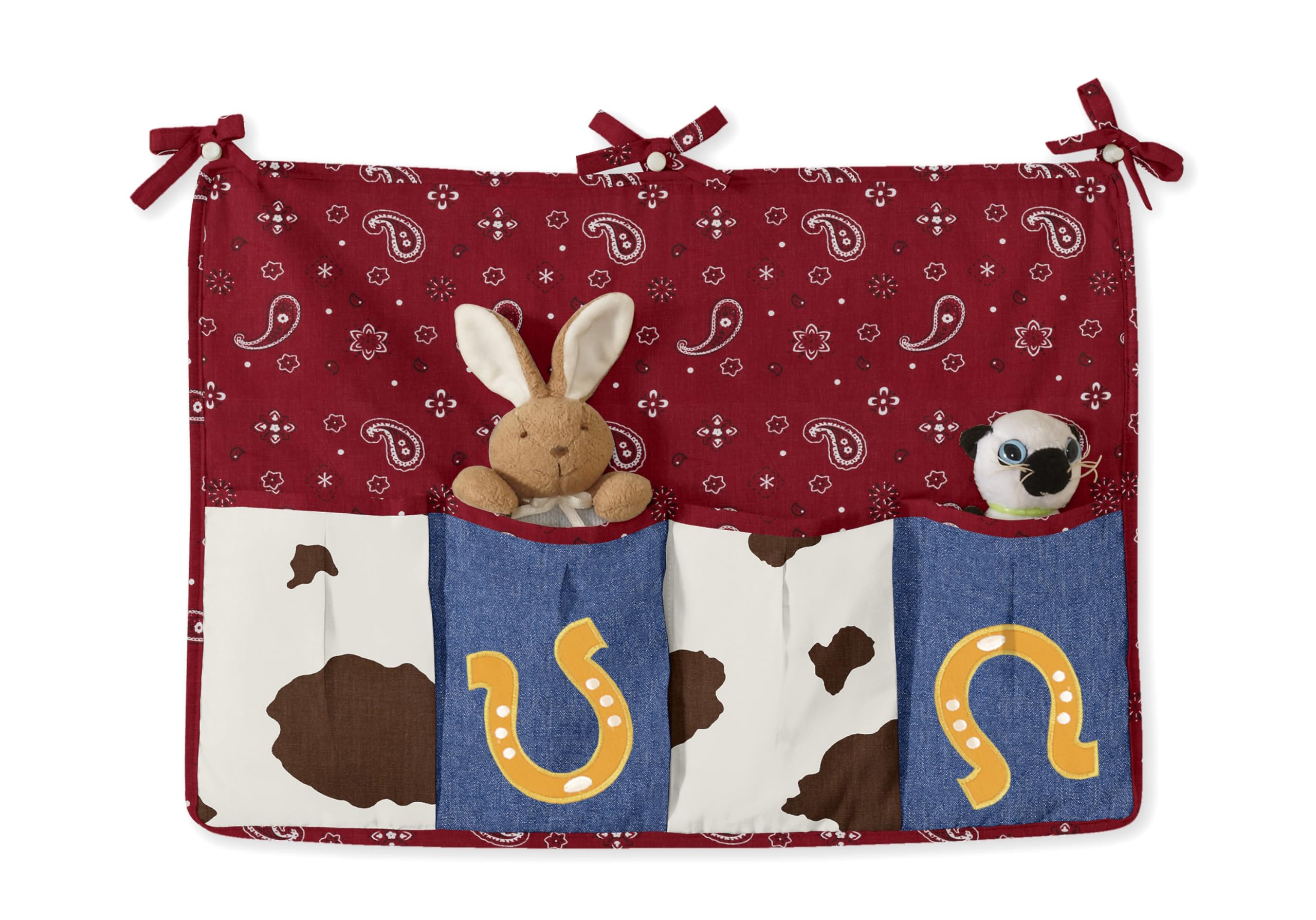 11 Piece Set Includes: Crib Blanket: 45 in. x 36 in., Skirt: 52 in. x 28 in. x 12 in. drop, Fitted Crib Sheet: 52 in. x 28 in. x 8 in. pocket, Valances: 15 in. x 84 in. each; fits standard rods up to .75 inches in diameter, Diaper Stacker: 15 in. x 20 in. x 6 in., Toy Bag: 14 in. x 20 in., Pillow: 10 in. x 10 in., Set of 3 Wall Hangings: 10 in. x 10 in. each
